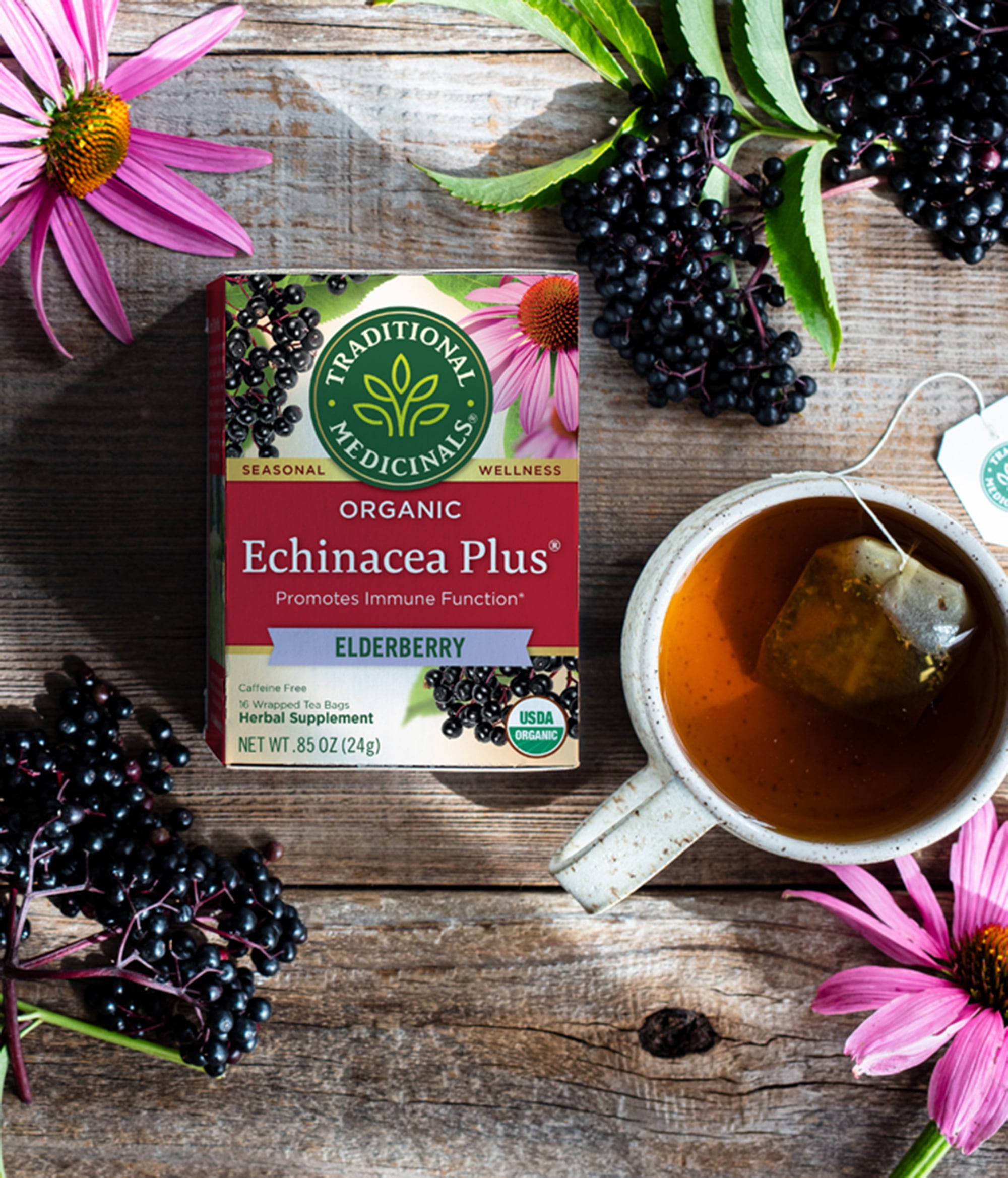 Traditional Medicinals Organic Echinacea Plus Elderberry Herbal Tea Bags 16 Ct. Native American tribes have long prized echinacea and elderberry for their immune-stimulating properties. Our herbalists have combined them to create a tasty herbal power team that makes it easy to forget you’re taking herbal medicine. Drink throughout the day when your system needs a boost. From field to cup, we make sure our teas deliver the benefits of these amazing plants. To deliver consistently high-quality teas, we source organically farmed or organically wild-collected herbs from ethical trading partnerships, seeking out medicinal-grade plants. Only a small fraction of the world’s herb supply meets our high-quality standards.