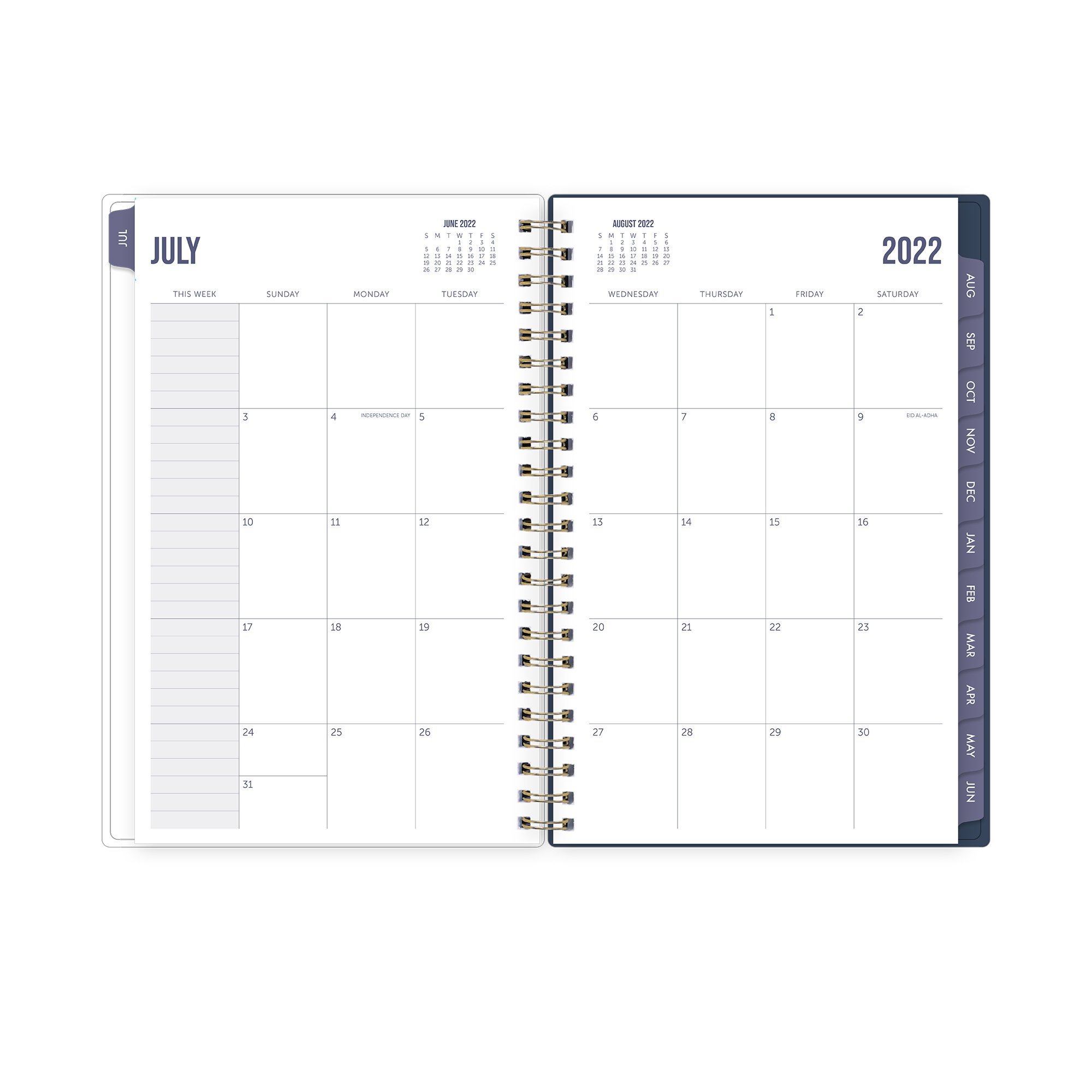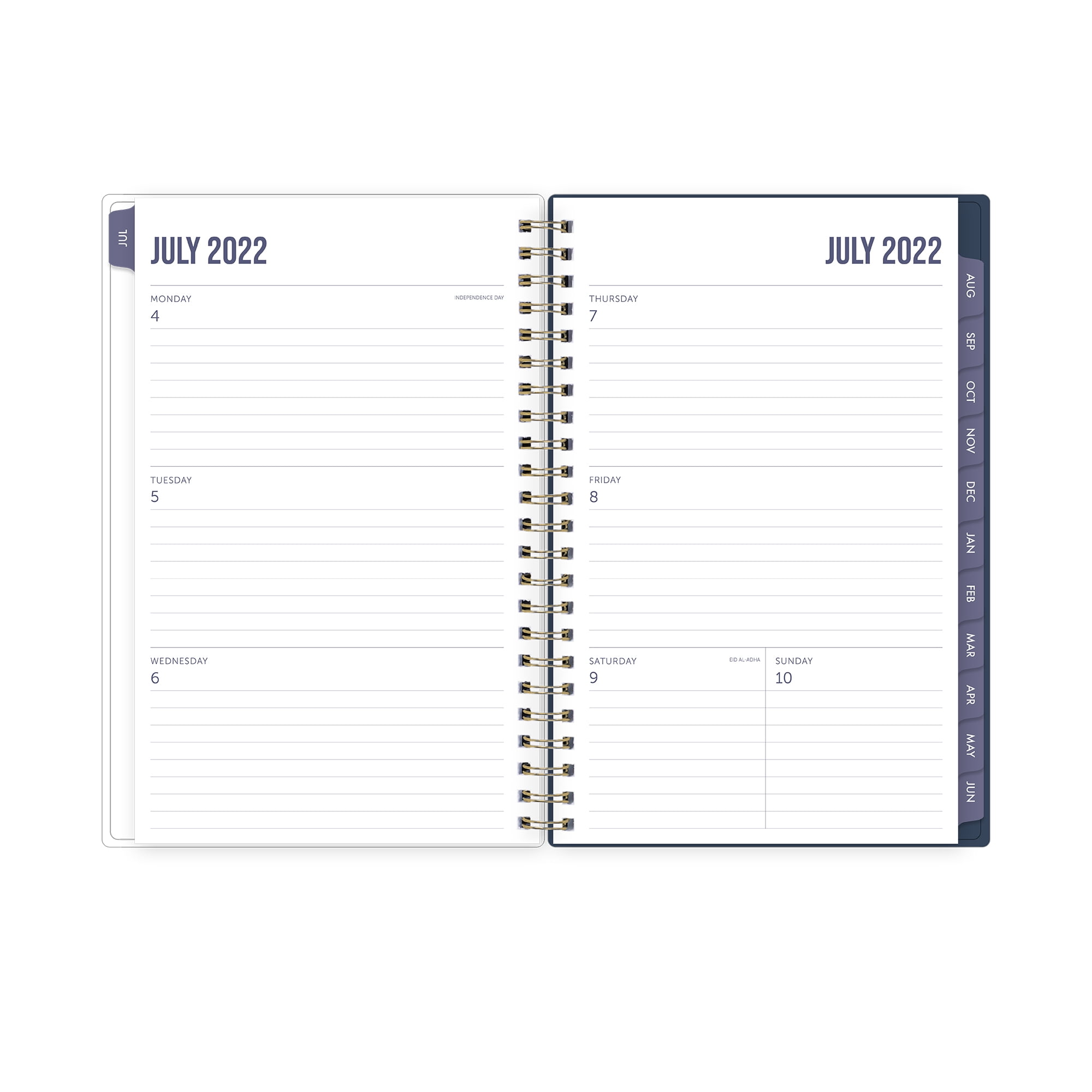 - 12 months of lined weekly and tabbed monthly calendars on two-page layouts