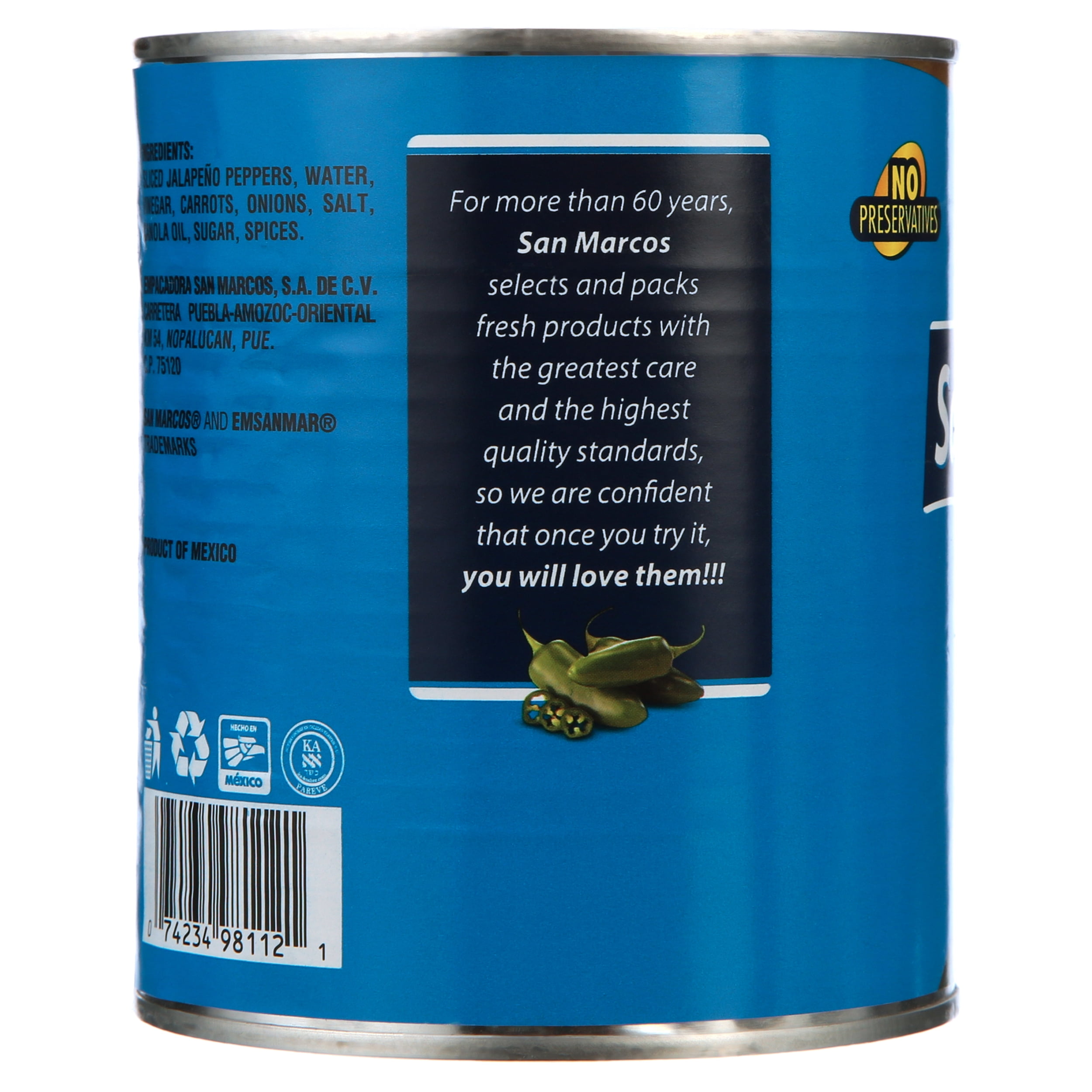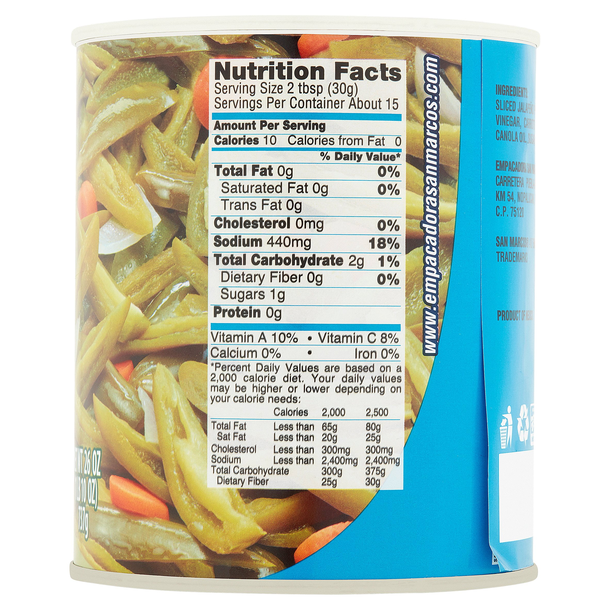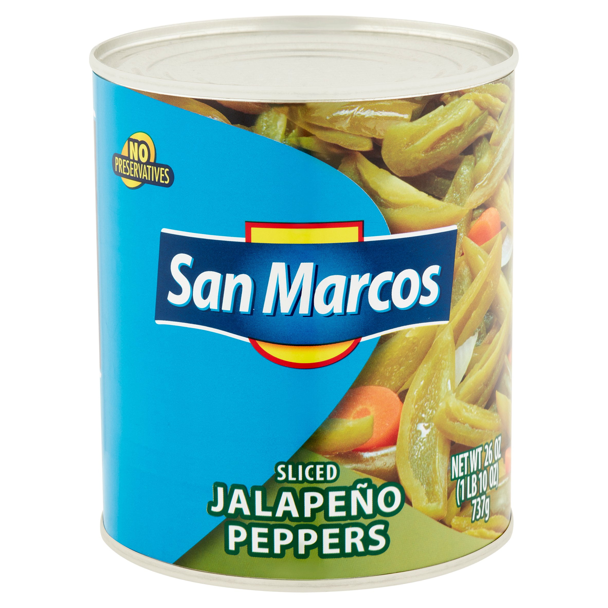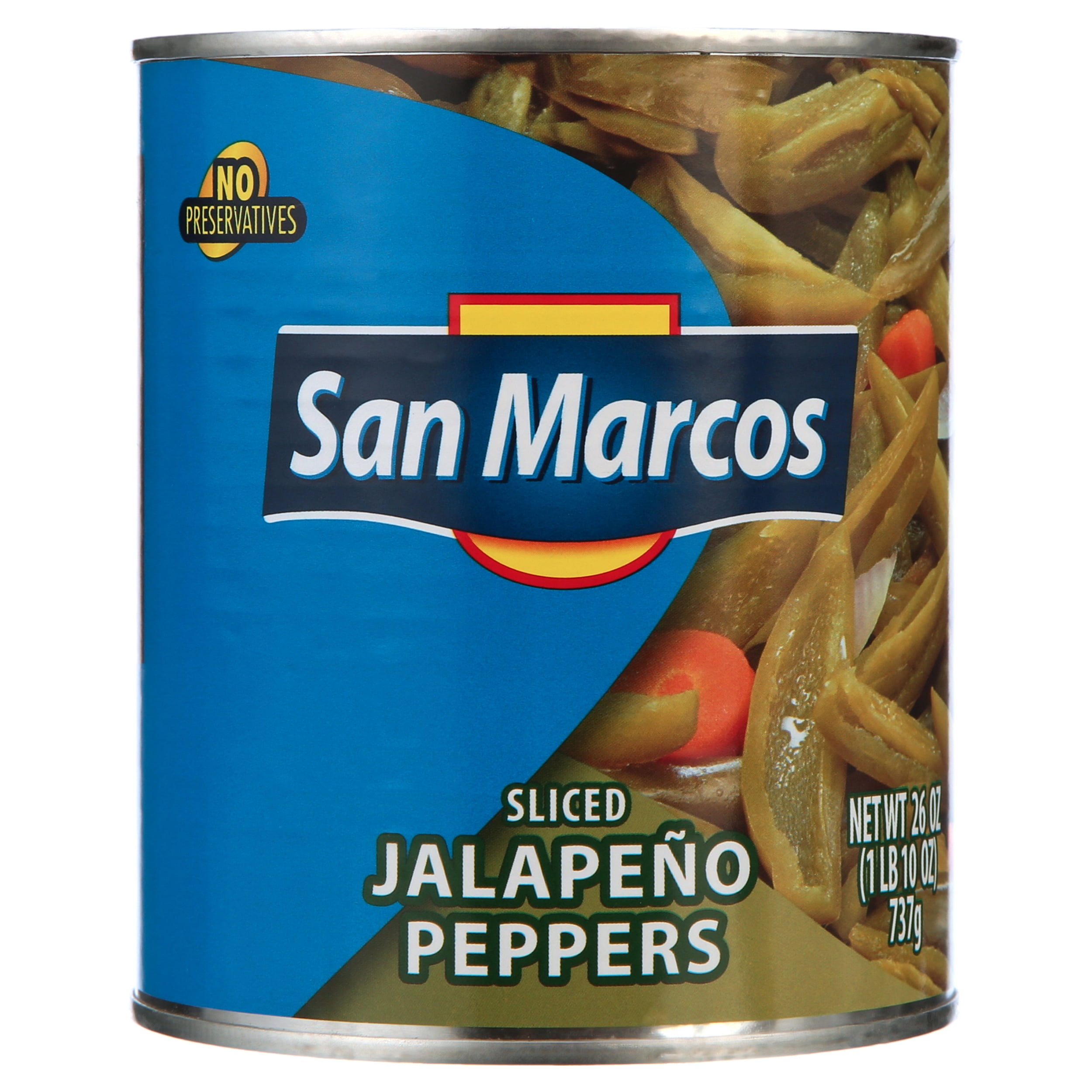 Enhance the flavor of your dishes with Empacadora San Marcos Sliced Jalapeno Peppers (26 oz). Add them to pizza, nachos and much more for a fiery touch. These jarred jalapeno peppers have no trans fat.