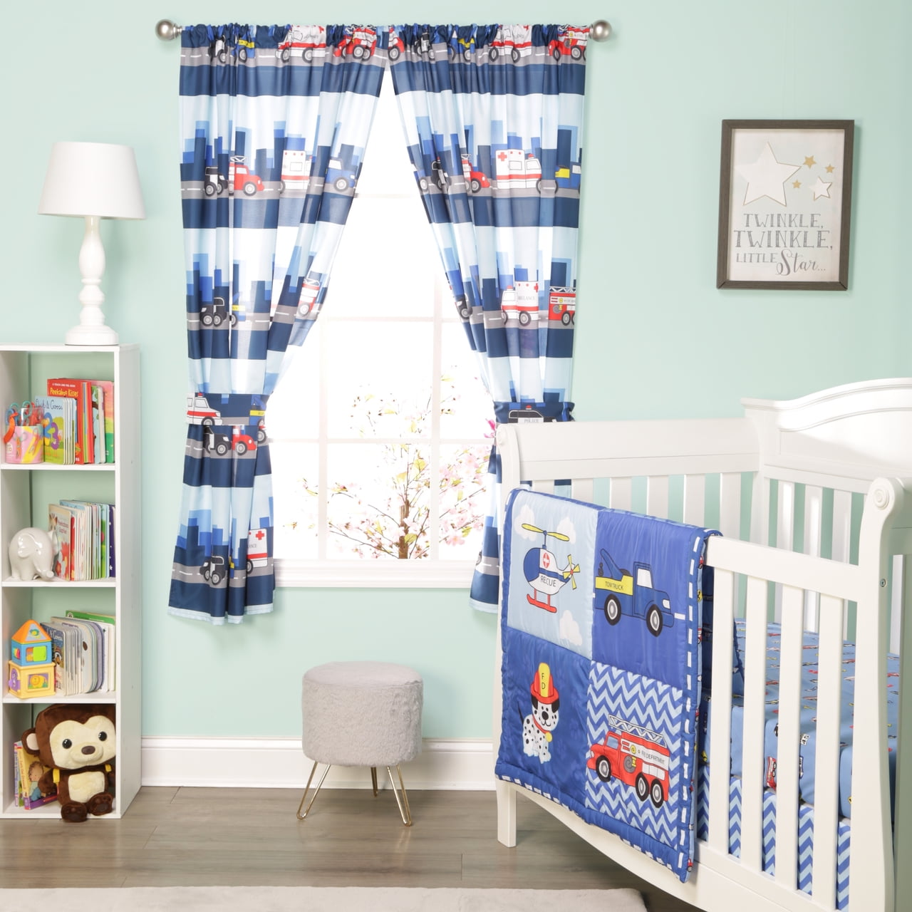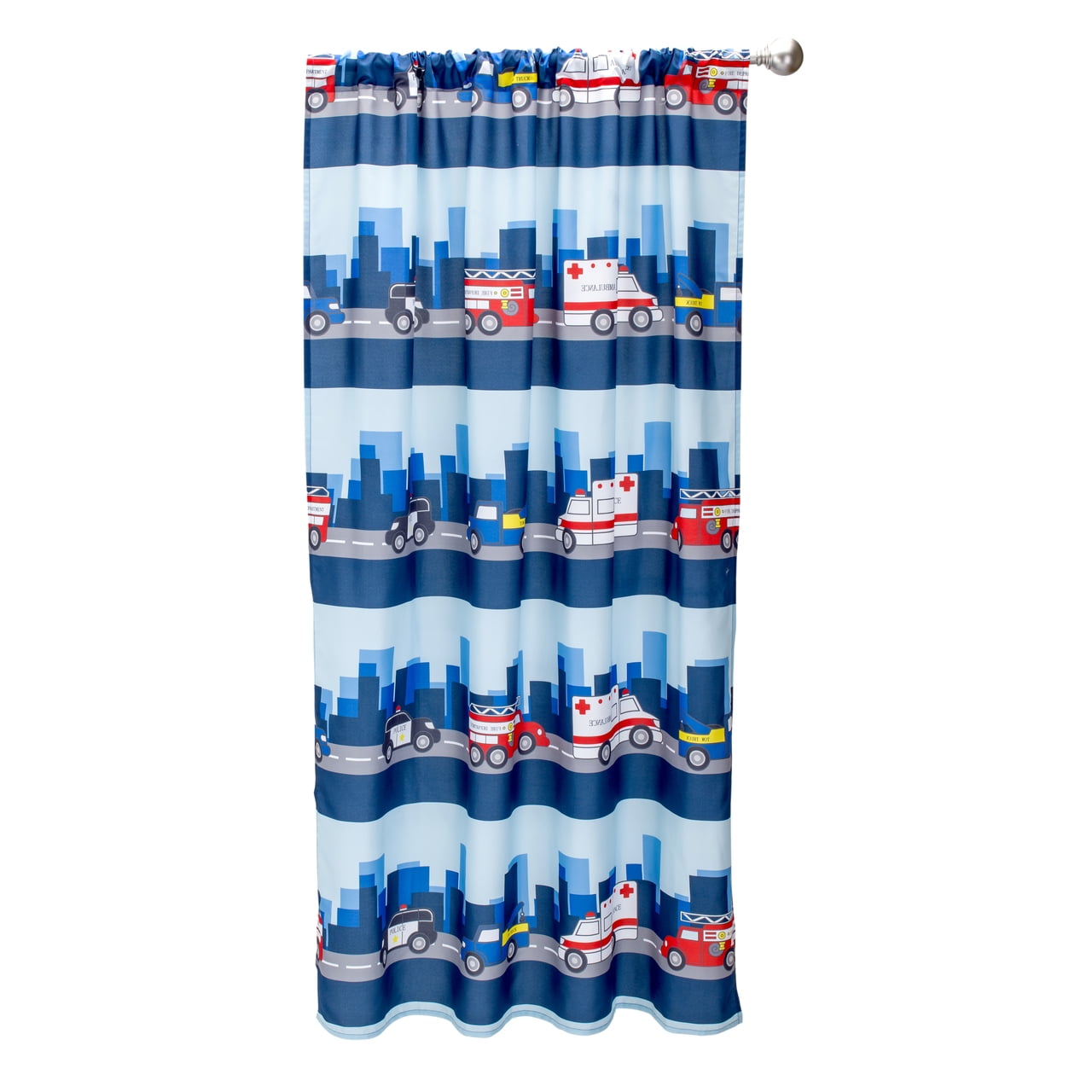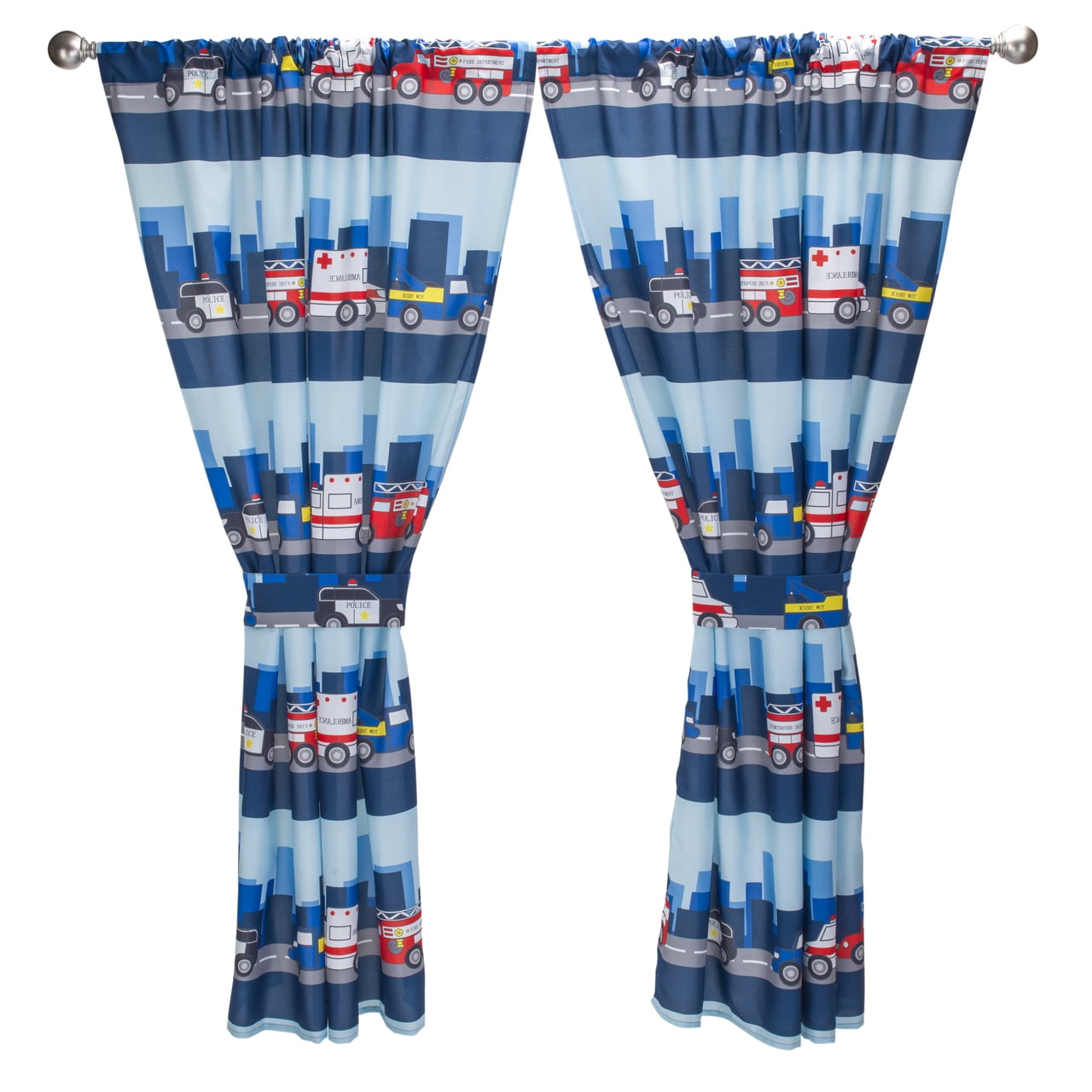Everyday Kids Rescue Fire and Police DrapesIndulge his or her love of helping people with curtains that celebrate our real heroes! If he loves seeing firetrucks and sheriff SUVs, he’ll love this rescue-inspired artistic pair of curtains! Each features bold and childlike images of the great vehicles needed for critical responses! Each curtain panel measures 41"W by 63"L and is easy to hang by inserting a rod through the 3" deep pocket. The microfiber polyester curtains are machine washable so they’re great for every room of your home, child care center or school! And, they’re so cool! Buy yours today!Product Details: RESCUE AND PATROL BOY’S BEDROOM DECOR: Encourage your young son’s love of first responding heroes! In dark and light blue colors, this pair of curtains features large and colorful cartoon-drawing images of hero icons, like ambulances, tow trucks and police cruisers!; INSPIRATIONAL LIFE-SAVING DÉCOR FOR BOY’S ROOM: Motivate your child’s emergency and social education through cool visuals in the design of his room! He’ll love playing and hanging out in his room with these awesome boy’s room truck curtains! Note: Tieback design may vary slightly.; SIZING INFORMATION: Each panel measures 41"W x 63"L for a total width of 82". Hang easily and quickly by inserting a 1.5" curtain rod through the 3" deep rod pocket.; GREAT FOR A BABY BOY NURSERY, TODDLER ROOM OR DAYCARE DÉCOR: Made from fade resistant and durable super-soft polyester microfiber fabric, these curtains are machine washable with tumble dry on low, so they’re great for playrooms, game rooms and classrooms, including home school rooms!; COORDINATING BEDDING ACCESSORIES SOLD SEPARATELY: Click the Visit the EVERYDAY KIDS Store link above to view matching space décor! All of our products adhere to strict CPSC and CPSIA safety standards.;