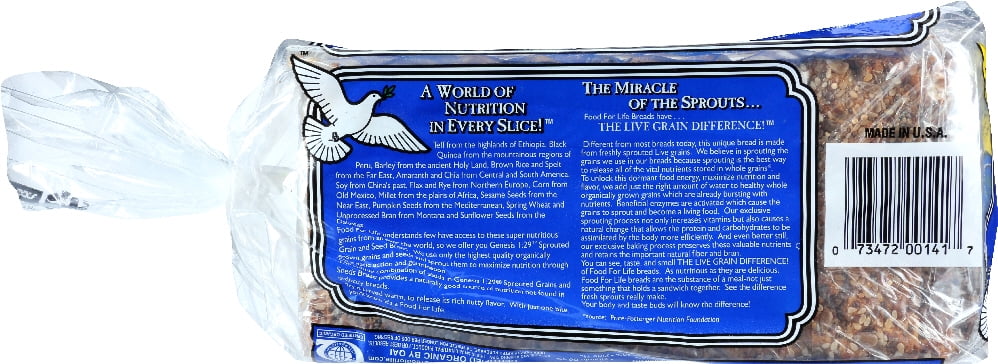 - The original. Certified organic grains. Certified organic by QAI. All natural. No preservatives. Good source of fiber. Side panel for nutritional facts. A world of nutrition in every slice! The live grain difference! See back panel for details. Teff from the highlands of Ethiopia, Black Quinoa from the mountainous regions of Peru, barley from the ancient holy land, brown rice and spelt from the Far East, amaranth and chia from Central and South America, Soy from China’s past, flax and rye from Northern Europe, corn from Old Mexico, millet from the plains of Africa, sesame seeds from the Near East, pumpkin seeds from the Mediterranean, spring wheat and unprocessed bran from montana and sunflower seeds from the Dakotas. For for Life understands a few have access to these super nutritious grains from all over the world, so we offer you Genesis 1:29 Sprouted and Seed Bread. We use only the highest quality organically grown grains and seeds and sprout them to maximize nutrition through enzymatic action and germination. The unique combination of seeds in Genesis 1:29 Sprouted and Seeds Bread provides a naturally good source of nutrition not found in ordinary breads. Try it served warm, to release its rich nutty flavor. With just one bite, you’ll know they’re a food for life! From the earliest days of human history, mankind has cultivated the precious seeds of the earth, in accordance with the provisions of Genesis 1:29, and God said, behold, I have given you every herb bearing to you it shall be for meat. – Gen 1:29. Based on the holy scripture verse Genesis 1:29, Food For Life brings you Genesis 1:29 Sprouted Grain & Seed Bread. Made from exotic grains and seeds from around the world and baked into one extraordinary nutritious loaf. The miracle of the sprouts – Food for Life breads have – The live grain difference! Difference from most breads today, this unique bread is made from freshly sprouted live grains and contains absolutely no flour. We believe in sprouting the grains we use in our breads because sprouting is the best way to release all of the vital nutrients stored in whole grains (Source: Price-Pottenger Nutrition Foundation). To unlock this dormant food energy, maximize nutrition and flavor, we add just the right amount of water to healthy whole organically grown grains which are already bursting with nutrients. Beneficial enzymes are activated which cause the grains to sprout and become a living food. Our exclusive sprouting process not only significantly increases vitamins, but also causes a natural change that allows the protein and carbohydrates to be assimilated by the body more efficiently. And even better still, our exclusive baking process preserves these valuable nutrients and retains the important natural fiber and bran. You can see, taste, and smell the live grain difference! of Food for Life breads. As nutritious as they are delicious, Food for Life breads are the substance of a meal – not just something that holds a sandwich together. See the difference fresh sprouts really make. So when you’re looking for nutrition in bread, reach for the sprouted grain breads from Food for Life and partake of the miracle. Your body and taste buds will know the difference! www.foodforlife.com. (915) 279-5090 – (800) 797-5090, Mo-Th 8-5, Fri 8-3 (PST). Glycemic Index: 43. .