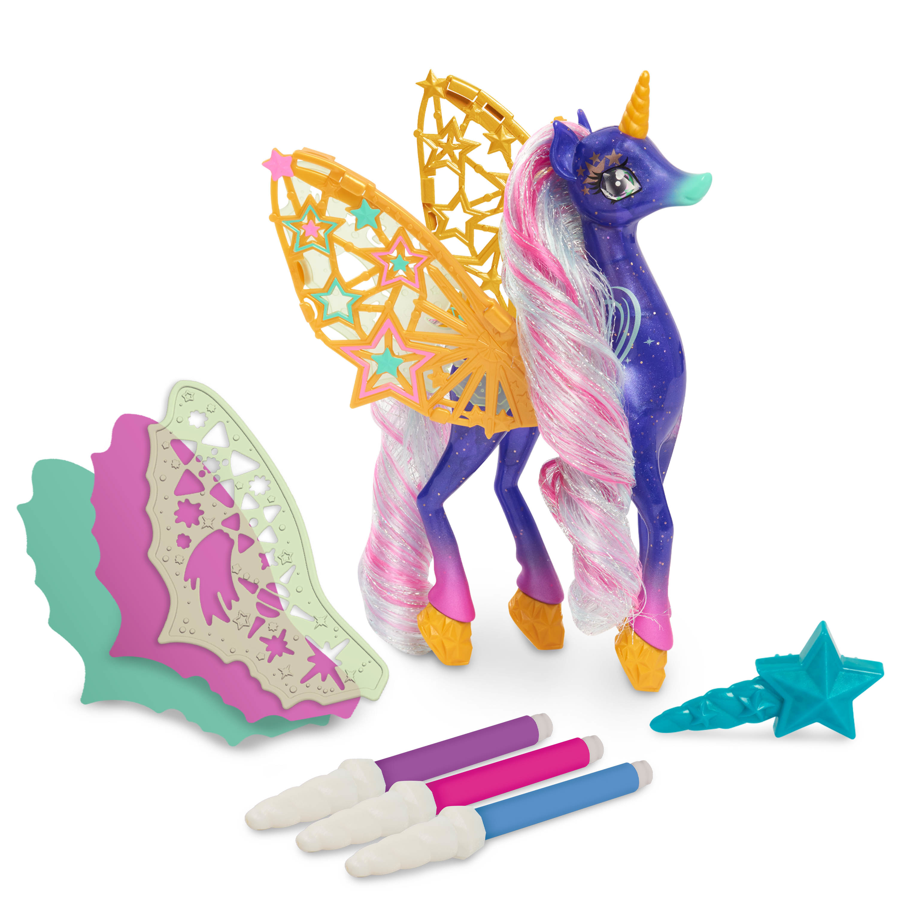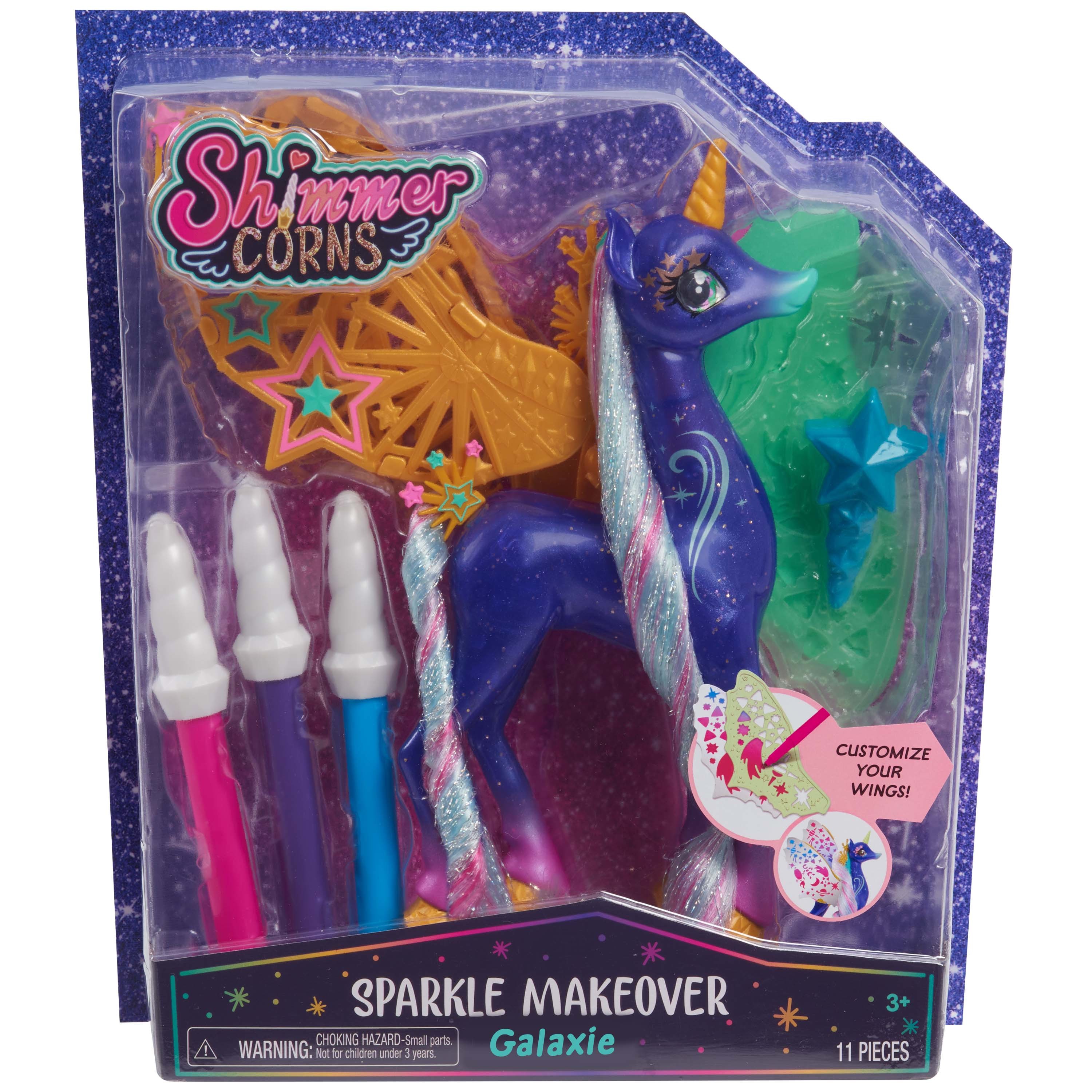 Add a shimmerific touch to playtime with the Sparkle Makeover Shimmercorns. These design-your-own unicorns offer a unique way of play and allow children to express their creative side by personalizing their Shimmercorn! Each unicorn comes with wings, stencils, markers, and a brush. Children will love using the stencils and markers to decorate the wings and allowing their imagination to shine through by uniquely changing their Shimmercorn’s look! Complete the ultimate Shimmercorn makeover by using the star brush to comb and style the unicorn’s flowing hair. Each Sparkle Makeover Shimmercorn stands 7.5 to 8.5 inches tall and features long vibrantly colored manes and tails with beautiful glittering accents. Bring a bit of shimmer home and collect both Sparkle Makeover Shimmercorns including Fern and Galaxie (each sold separately). Set includes: one Shimmercorn, two wing stencils, two pairs of wings to decorate, three markers, and one brush. Ages 3+