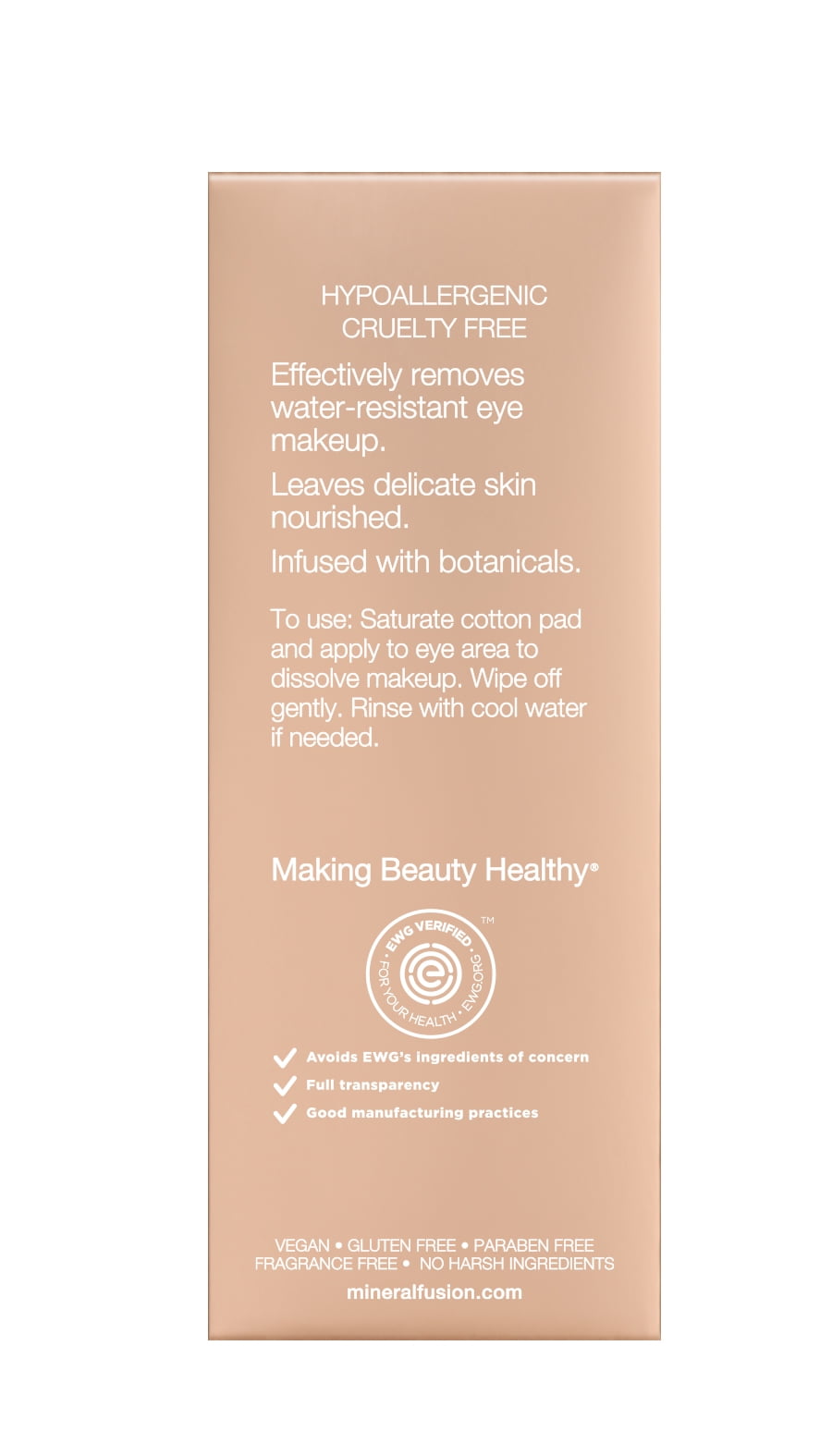 Mineral Fusion’s Eye Make Up Remover gently and effectively removes Eye Makeup. Easy-to-use, gel solution utilizes mineral-rich clay to dissolve even water-resistant makeup and clean the eye area. It is a unique mineral blend strengthens and revitalizes skin while Aloe Vera, Cucumber, Calendula, and Vitamin E nourish and leave the delicate eye area soft and soothed. All of Mineral Fusion’s products are Hypoallergenic, Cruelty Free, Vegetarian, Gluten Free, No Harsh Ingredients, Fragrance Free, Paraben Free, Phthalate Free.