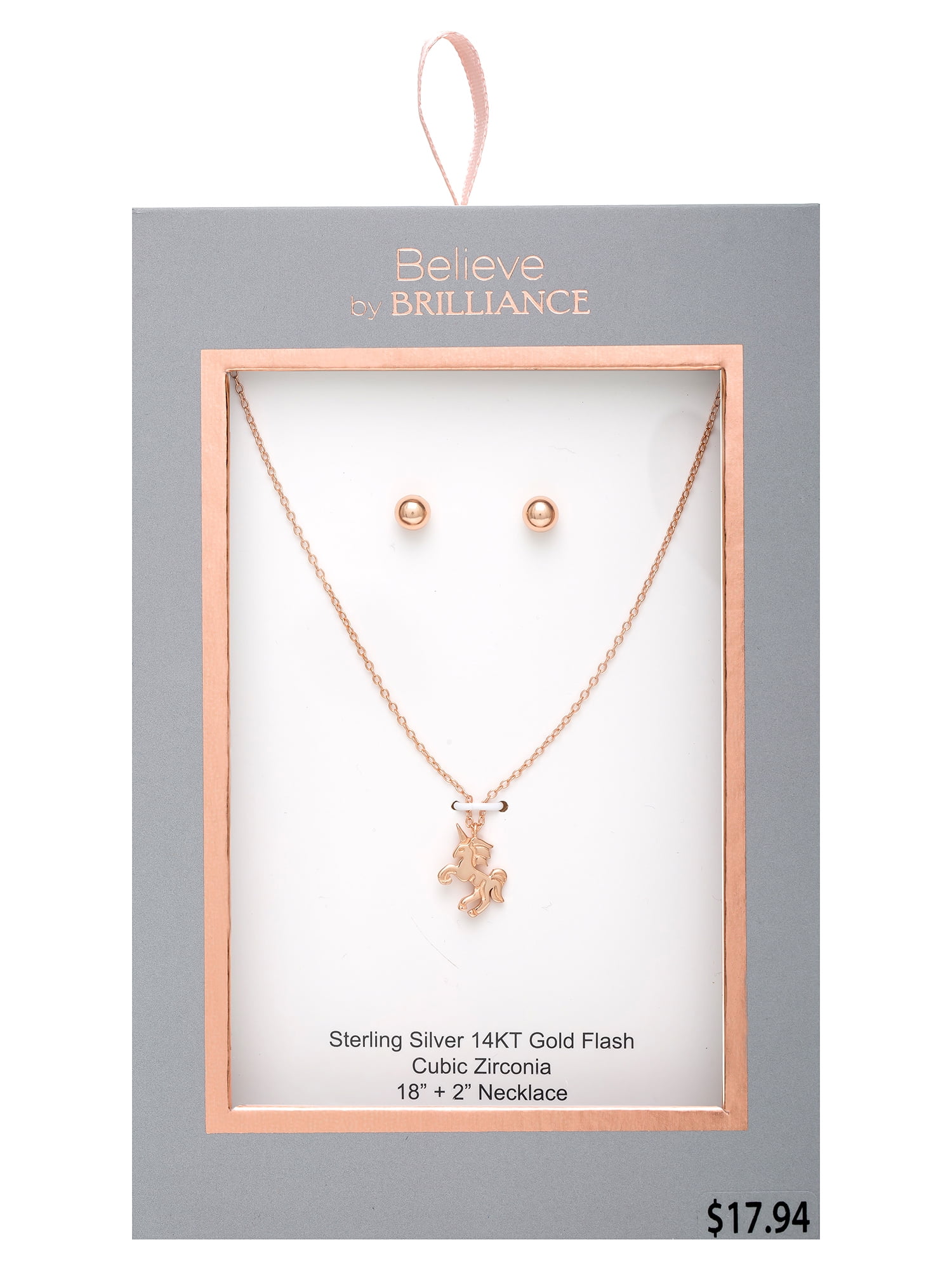 Be on trend with this fashionable unicorn pendant and earring set. Crafted in sterling silver 14kt gold plated. The pendant comes with an 18" + 2" extender chain with spring ring clasp for a secure and comfortable fit. The earrings are secured with a friction back post for a secure fit. The set comes packaged in a gift box with keepsake pouch making it an ideal gift for any gift giving occasion including including birthdays, Mother’s Day, Valentine’s Day, Christmas or just to treat yourself.