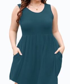 SHOWMALL Plus Size Summer Dress for Women Lake Blue 3X Casual Sleeveless Crewneck Flowy Pleated Sun Beach Boho Elegant Girls Babydoll Swing Dresses with Pockets