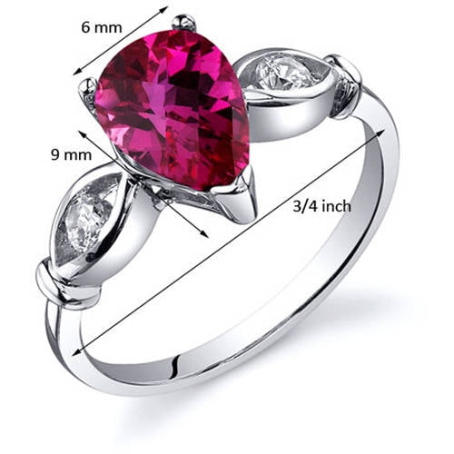 Complete your look with this Sterling Silver 1.50ct total weight Ruby cocktail ring. This Created Ruby ring is just right for special occasions or anytime you want to spice up your everyday outfit. The breathtaking red Ruby is the star of this Sterling Silver ring. At the center of this classic ring is a pear shape Created Ruby that is accented with delicate cubic zirconia. This women’s Sterling Silver cocktail ring is stamped with 925 to ensure authenticity. This ring comes with a signature gift box and makes a wonderful gift.