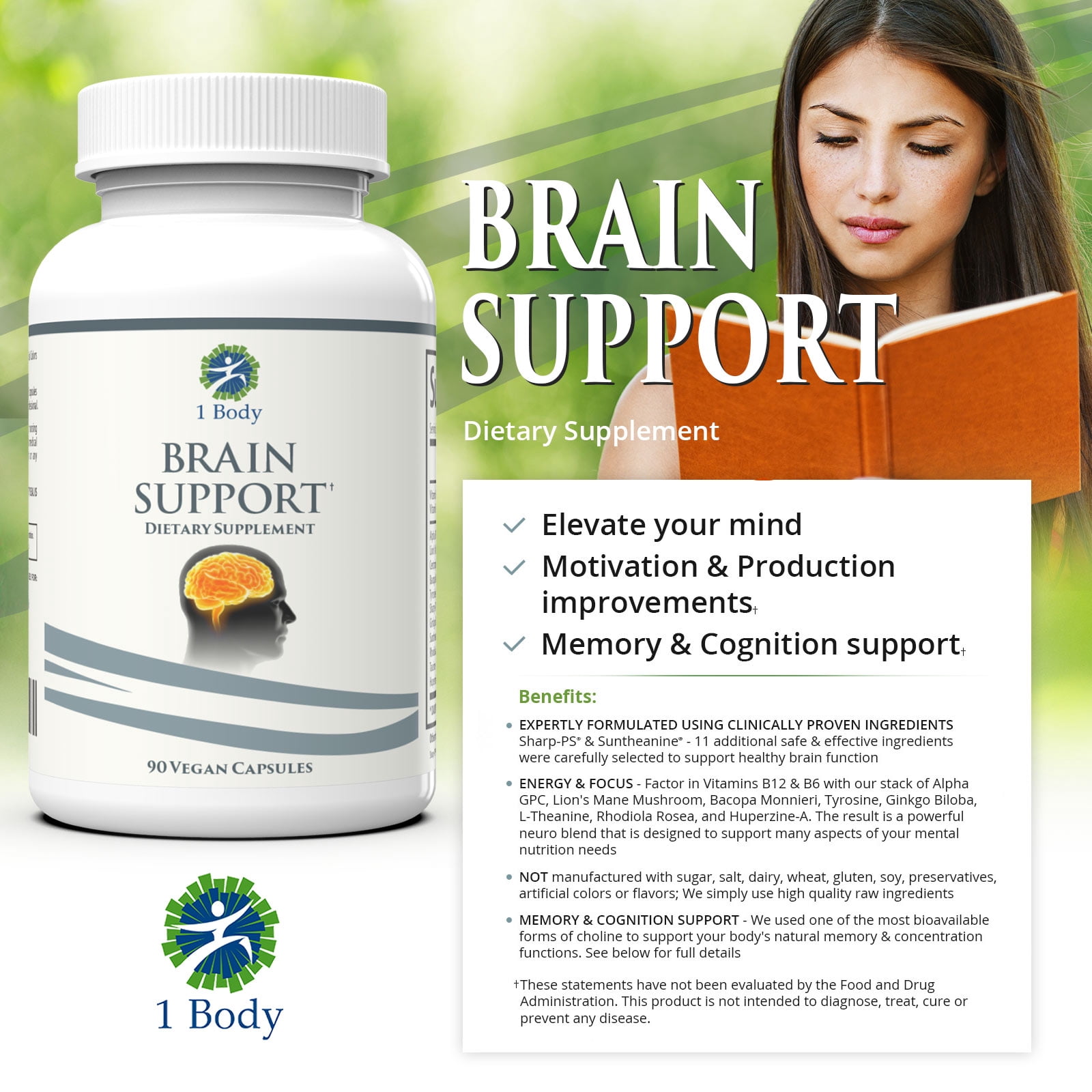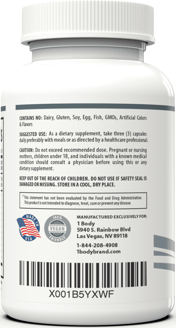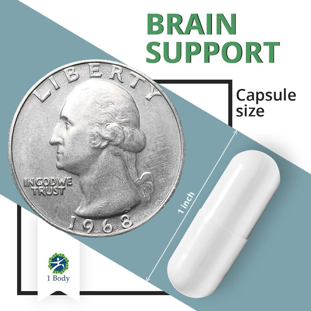 1 Body Brain Support Supplement boosts focus with a special blend of vitamins and nootropics such as Lion’s Mane. These nourish your mind and promote better recall and memory retention to improve your communication skills, enhance learning and retain access to memories. Alpha GPC supports cognitive acuity while L-Theanine improves memory and cognitive function. Bacopa sharpens synaptic communication and cognition and huperzine A enhances memory and learning. Other ingredients in the focus booster supplement also include Phosphatidylserine, Ginkgo Biloba and Rhodiola Rosea. The supplement works without the need for caffeine or other stimulants, elevating serotonin and dopamine for a better mood. Pure ingredients deliver a non-GMO and vegan-friendly capsule that’s soft and easy to swallow. Third-party tested, it’s made in the USA in our GMP-certified facility. The energy and mood boosting supplement contains no food allergens such as soy, dairy or gluten and uses no artificial colors or flavors.