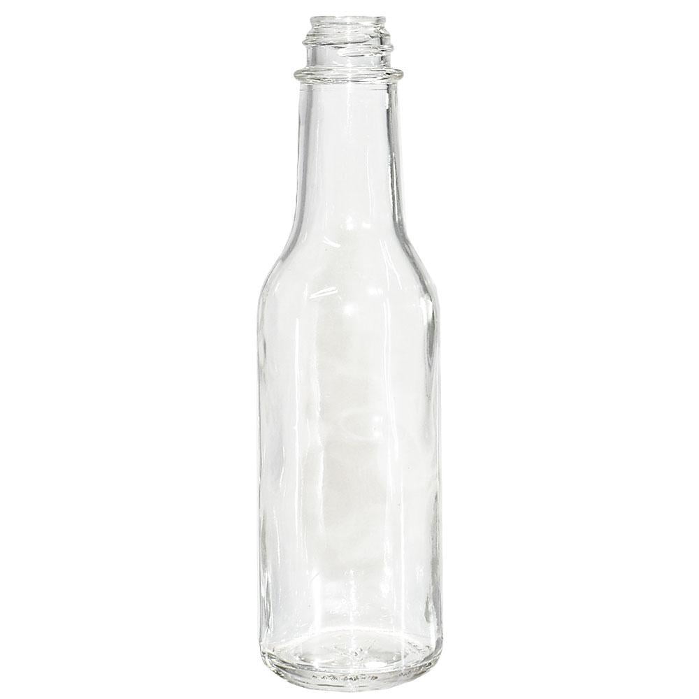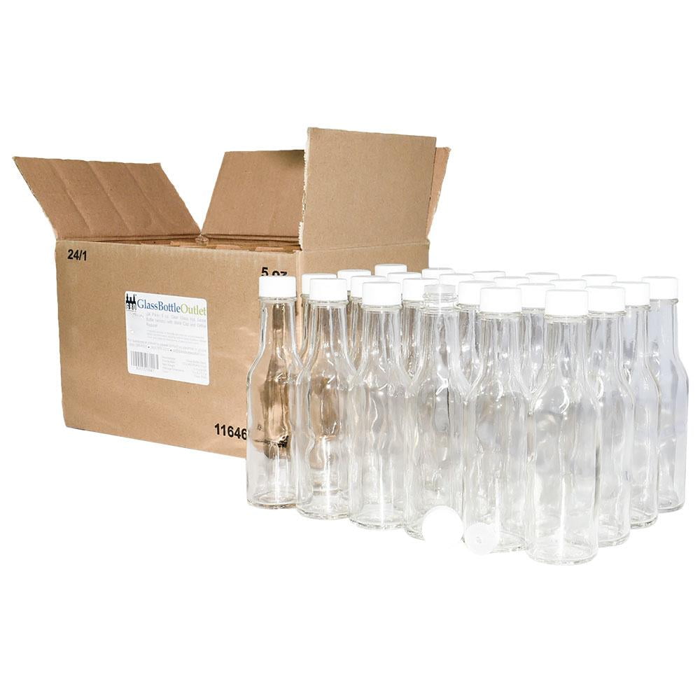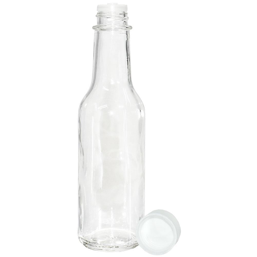 - (Pack of 24) – 24 – 5 oz. Clear Glass Hot Sauce Bottles (woozy) with 24 – White Unlined Caps and 24 – Orifice Reducers
