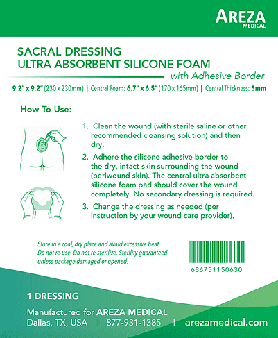 Areza Sacral Silicone Ultra-Absorbent Foam with Adhesive Border consists of a fenestrated silicone wound contact layer, a triple-layer ultra-absorbent pad, and a vapor permeable, waterproof polyurethane (PU) film backing. The multi-layer construction facilitates dynamic fluid management to provide optimal moist wound environment leading to the promotion of faster wound healing; which may help reduce the risk of maceration. The gentle silicone layer can be removed without losing its adherence and can minimize pain and trauma to the wound and its surrounding skin. The triple-layer absorbent pad layer composed of a PU foam layer, a thin non-woven layer, and an ultra-absorbent layer, provides superior absorption and locks away exudates.