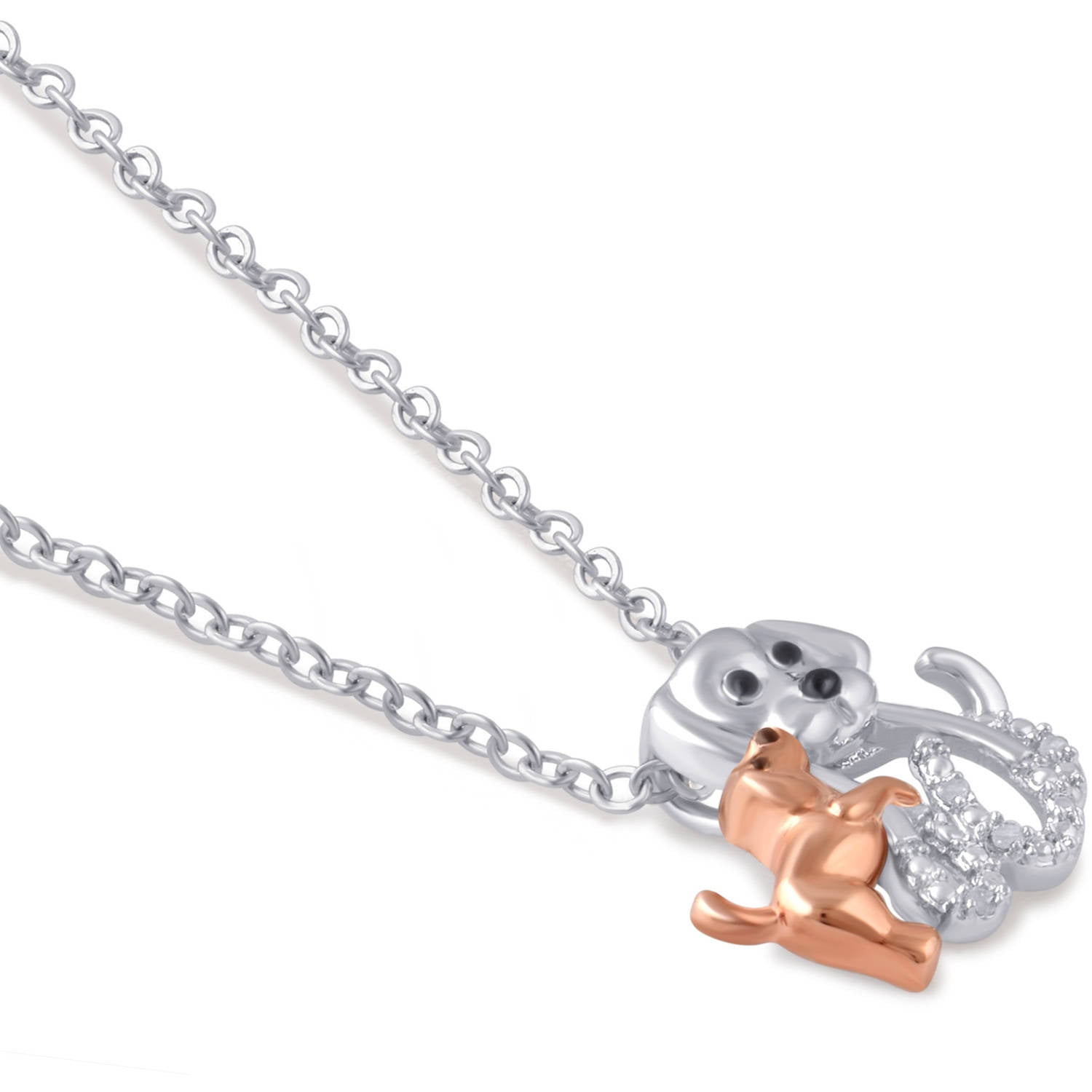 Diamond Accent Two-Tone Dog Mom and Child Pendant: The perfect gift for a mother, this sweet and graceful necklace showcases gentle puppies playing together, representing mama and baby. The blush of rose gold-tone juxtaposes delightfully with the silver color, and the accenting diamonds lend sparkle and shine. The chain length is 18". This fine piece of jewelry can be worn by adults or teens and be gifted to your wife, girlfriend, mother, sister or your friend.
