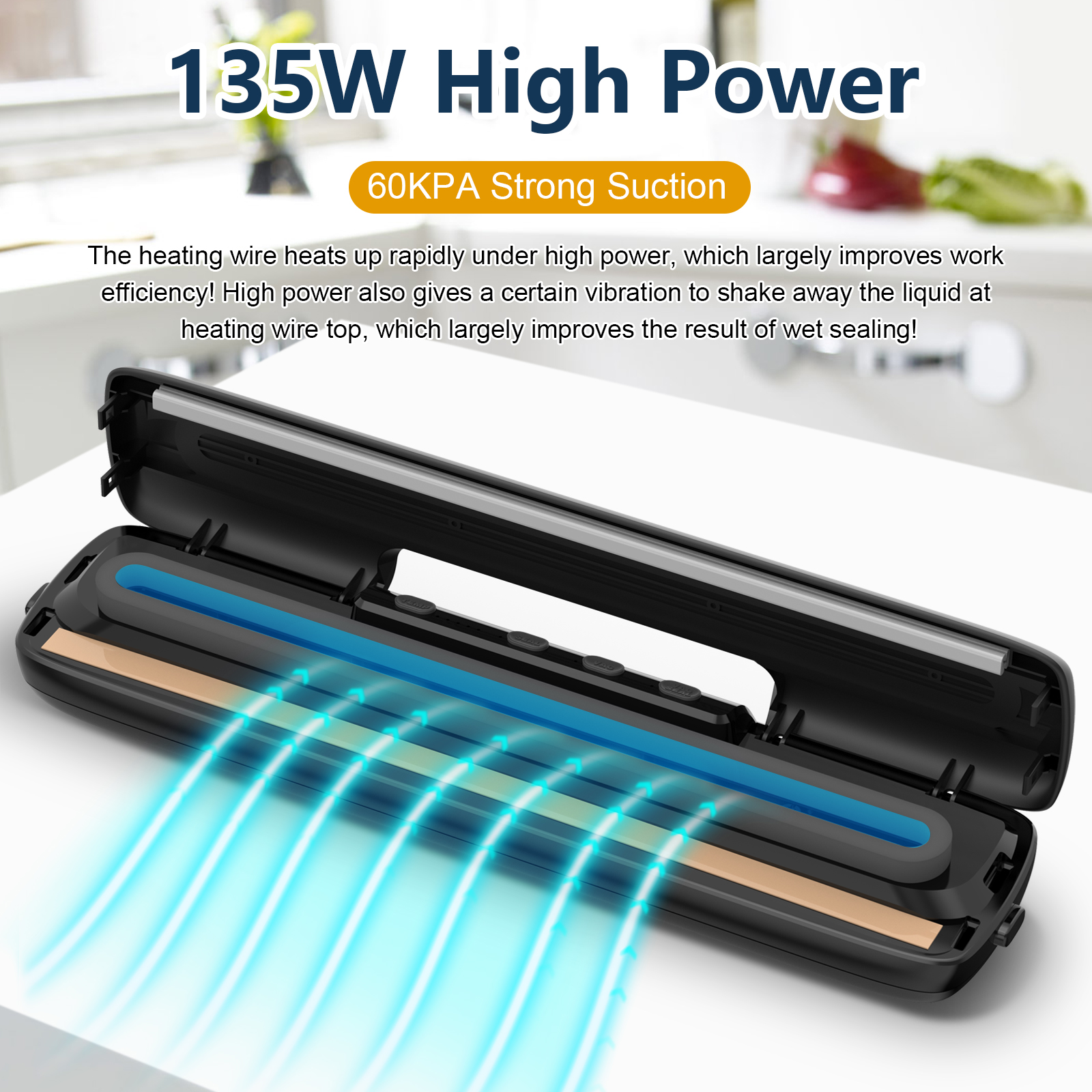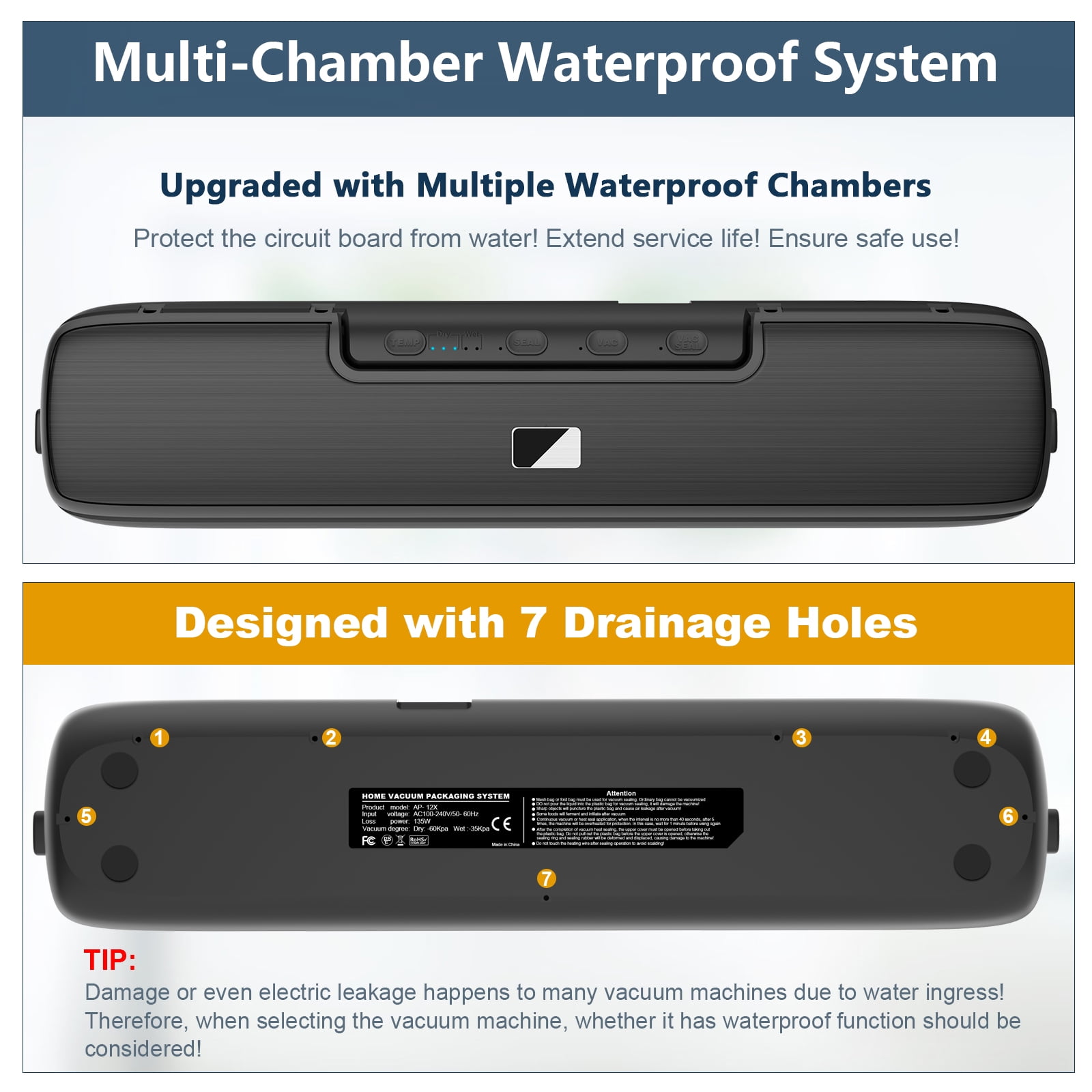 4) WATERPROOF SYSTEM — Featuring a multi-chamber waterproof system, the vacuum food sealer protects the circuit board from water, extends the service life and ensures your safe use! Damage or even electric leakage happens to many vacuum sealer for food due to water ingress! Therefore, waterproof function is important!
