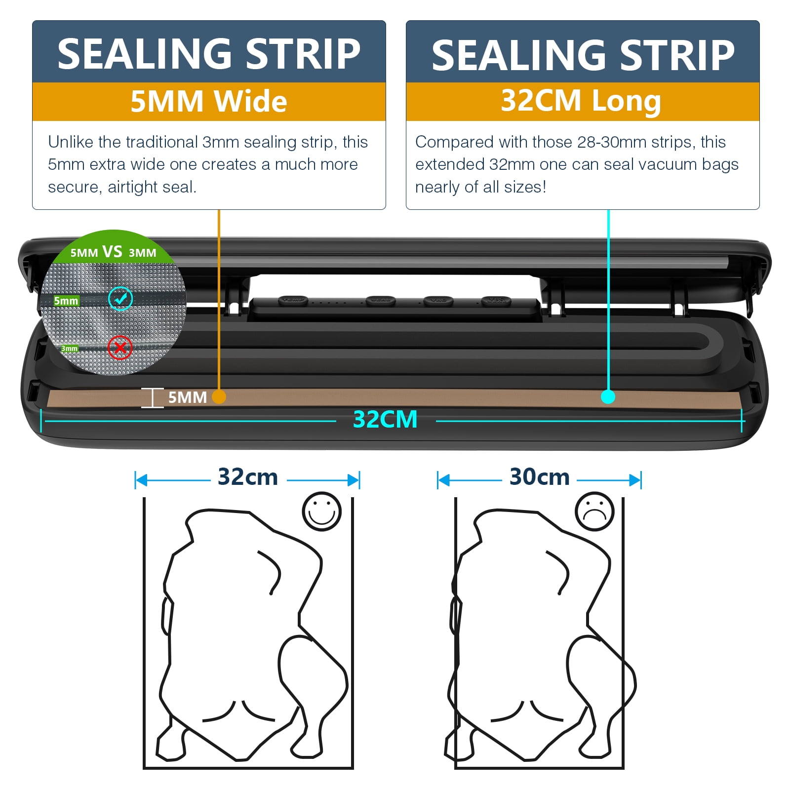 3) SEALING STRIP: 5MM Wide & 32CM Long — Unlike the traditional 3mm sealing strip, this 5mm extra wide one creates a much more secure, airtight seal. Compared with those 28-30cm strips, this extended 32cm one can seal vacuum bags nearly of all sizes!