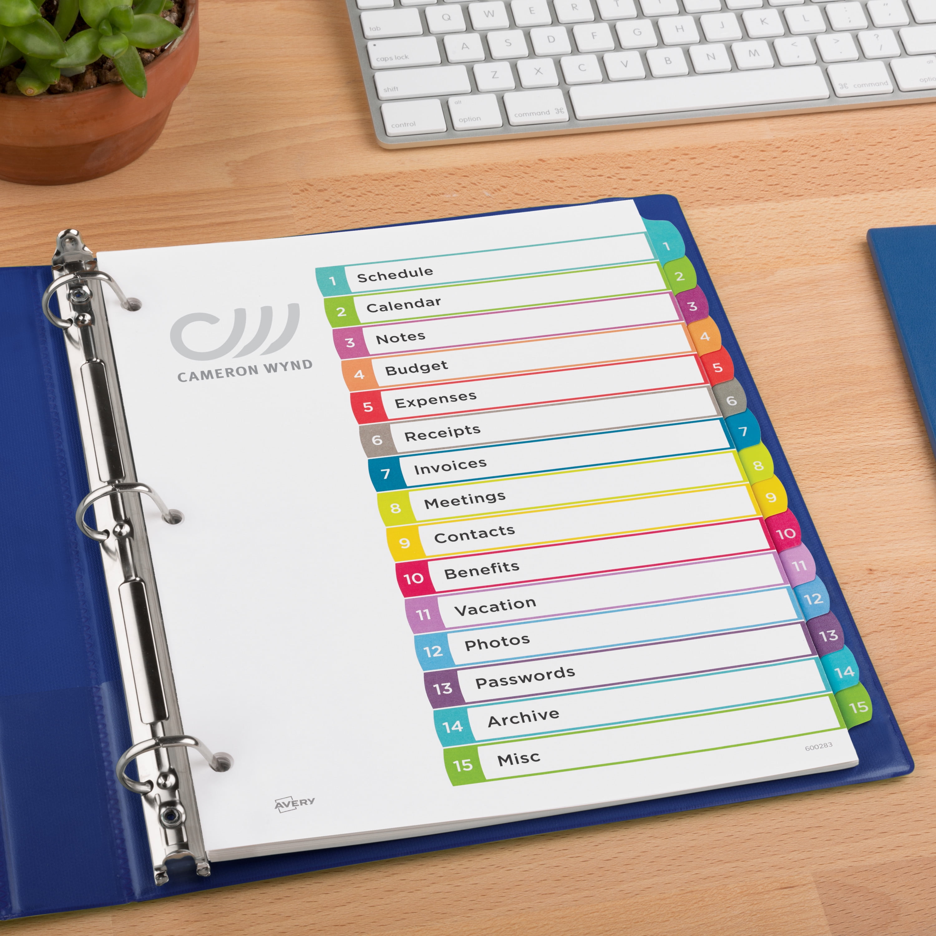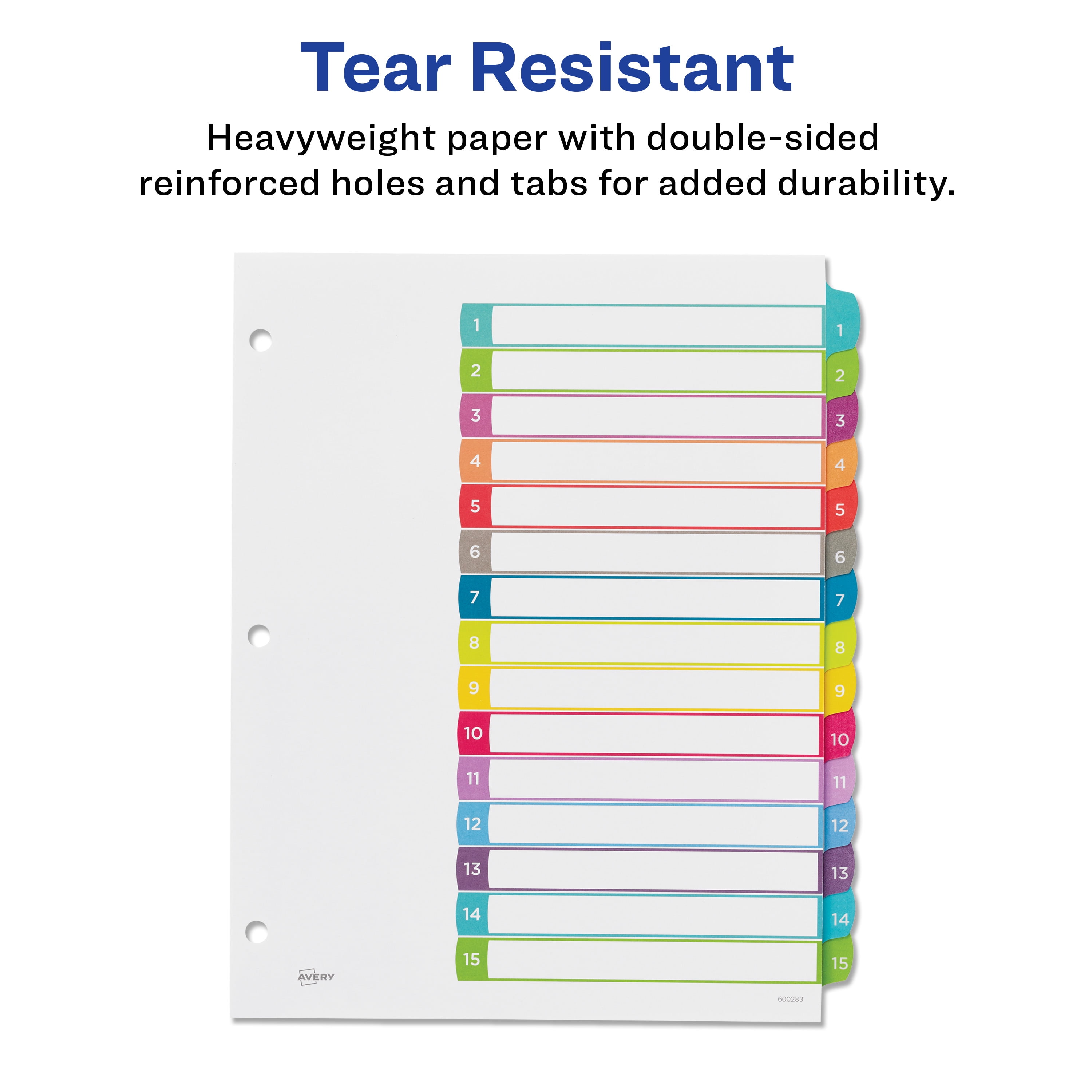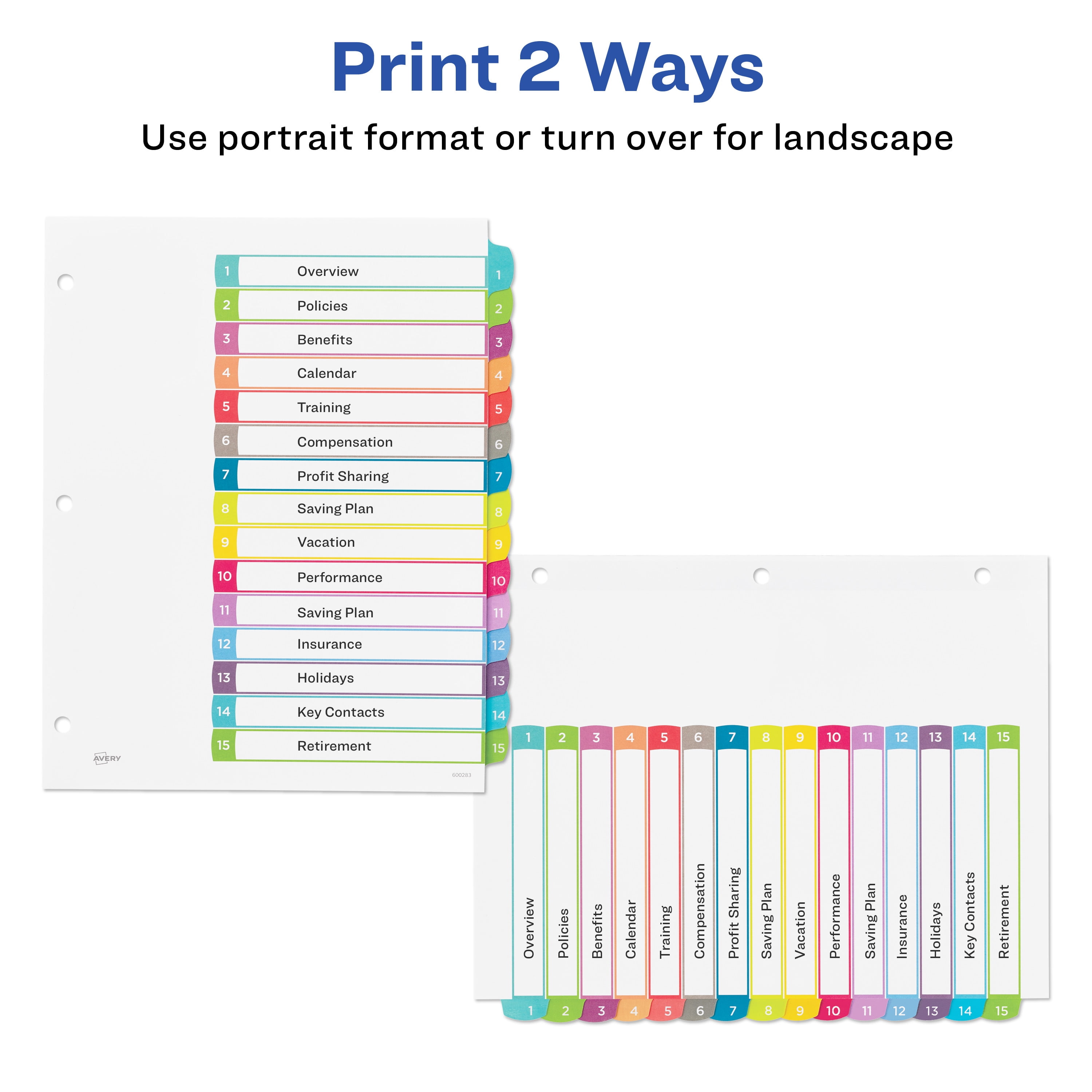 Give your binders a refreshing new look with Avery Ready Index Dividers. Each divider tab features a bright, contemporary color scheme with arched tabs. Print your own custom section titles and images onto the table of contents sheet without worrying about labels or inserts. Whether you’re creating planners for classes or hosting a presentation, these dividers are ideal for getting everything sorted. The 15 tabbed dividers are included with each sheet measuring 8-1/2"x11". The 3 binder holes are reinforced on both sides of the heavyweight sheet to prevent creasing and tearing. Each divider tab includes additional reinforcement along the edge of each page to distribute stress and resist folding. The printable table of contents is dual compatible with both laser and inkjet printers. Try out free templates for these dividers and check out the Avery Design & Print software at avery.com/templates.