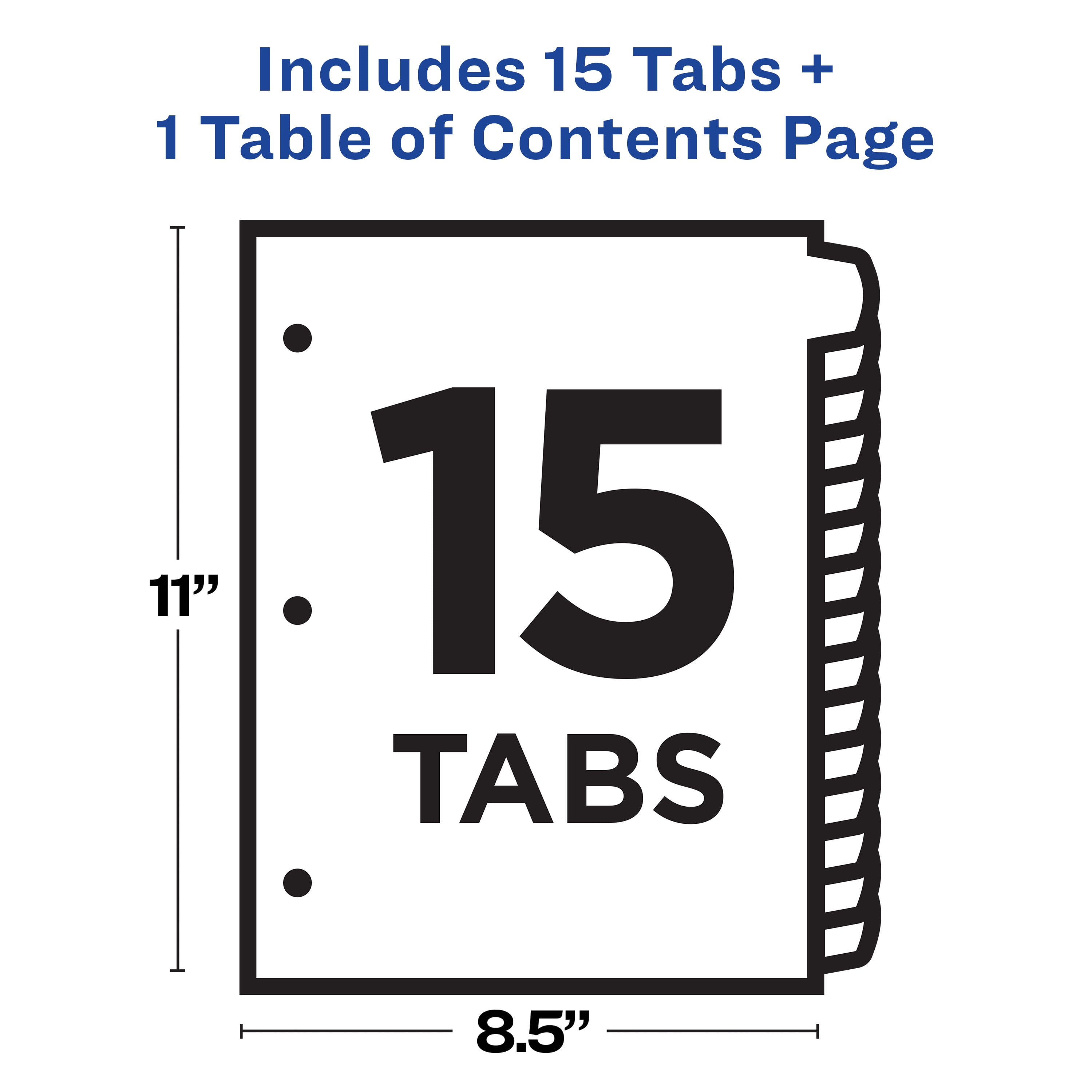- 15 dividers are included with sturdy tab and hole reinforcements on both sides
