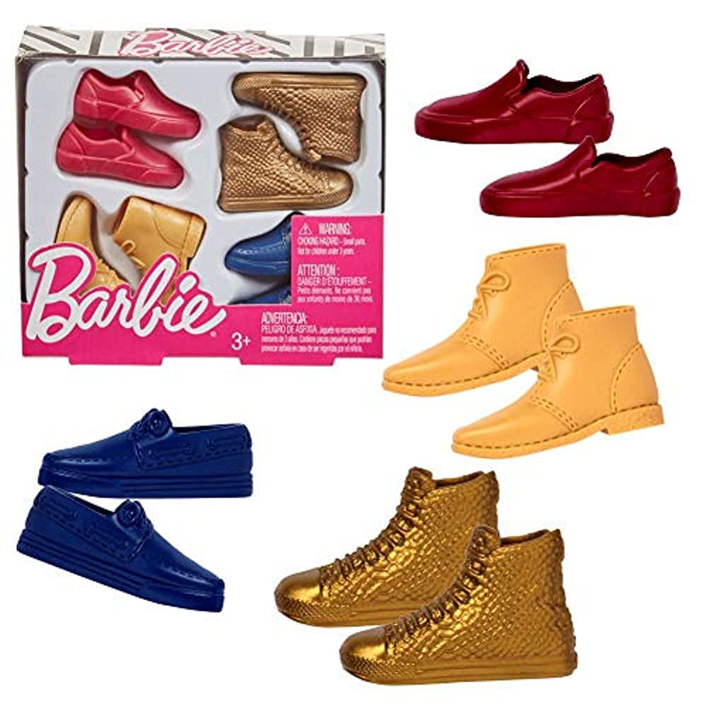 Kids can dress up Ken doll to step out in style this Ken shoe pack includes four pairs doll not included sold separately subject to availability Accessorize Ken doll for all occasions with the different styles and colors Kids can take him wherever their imaginations lead because when a girl plays with Barbie she imagines everything she can become Collect other Barbie and Ken doll clothes and accessories for even more styling and storytelling possibilities Each sold separately subject to availability Colors and decorationsBarbie Ken Men s Shoes Pack