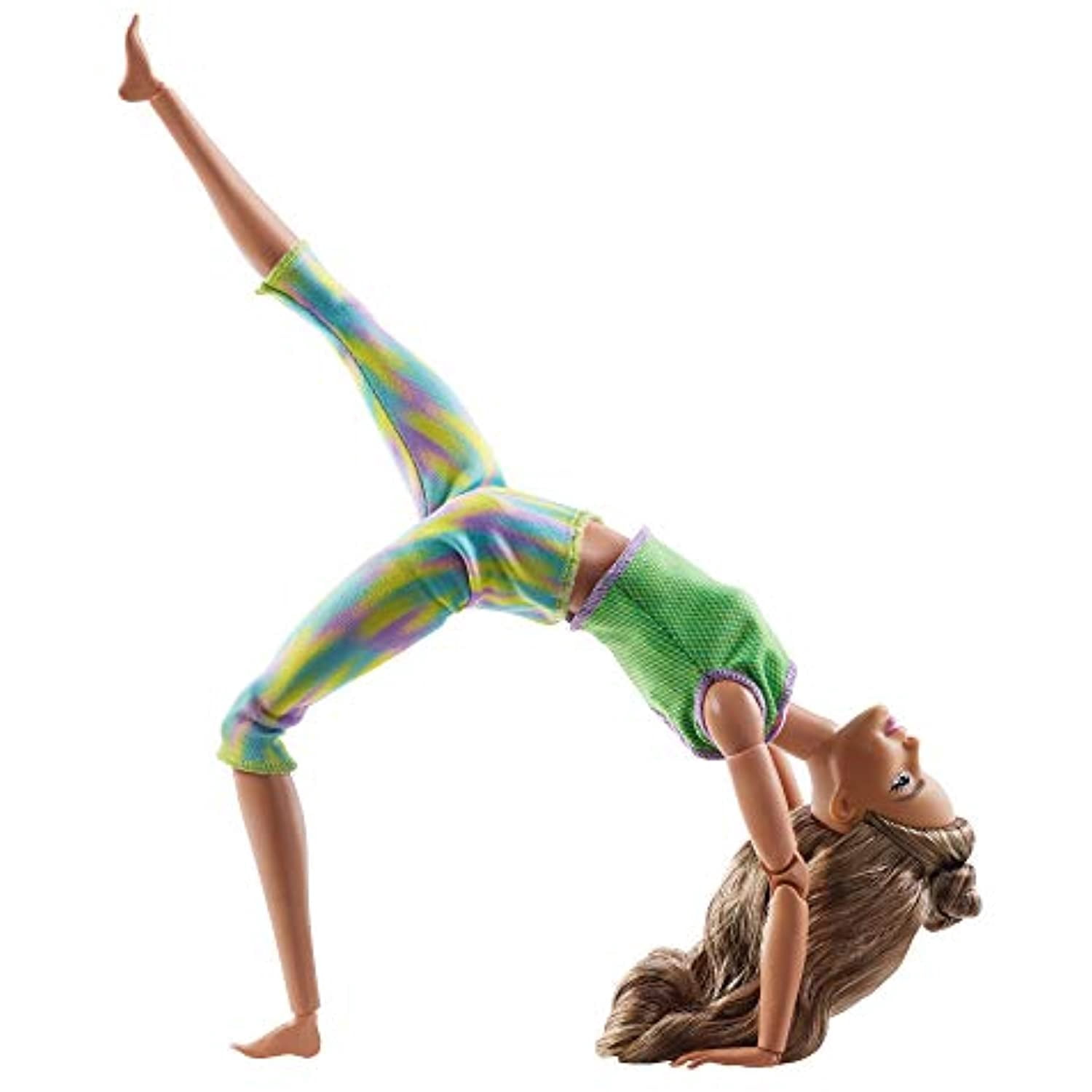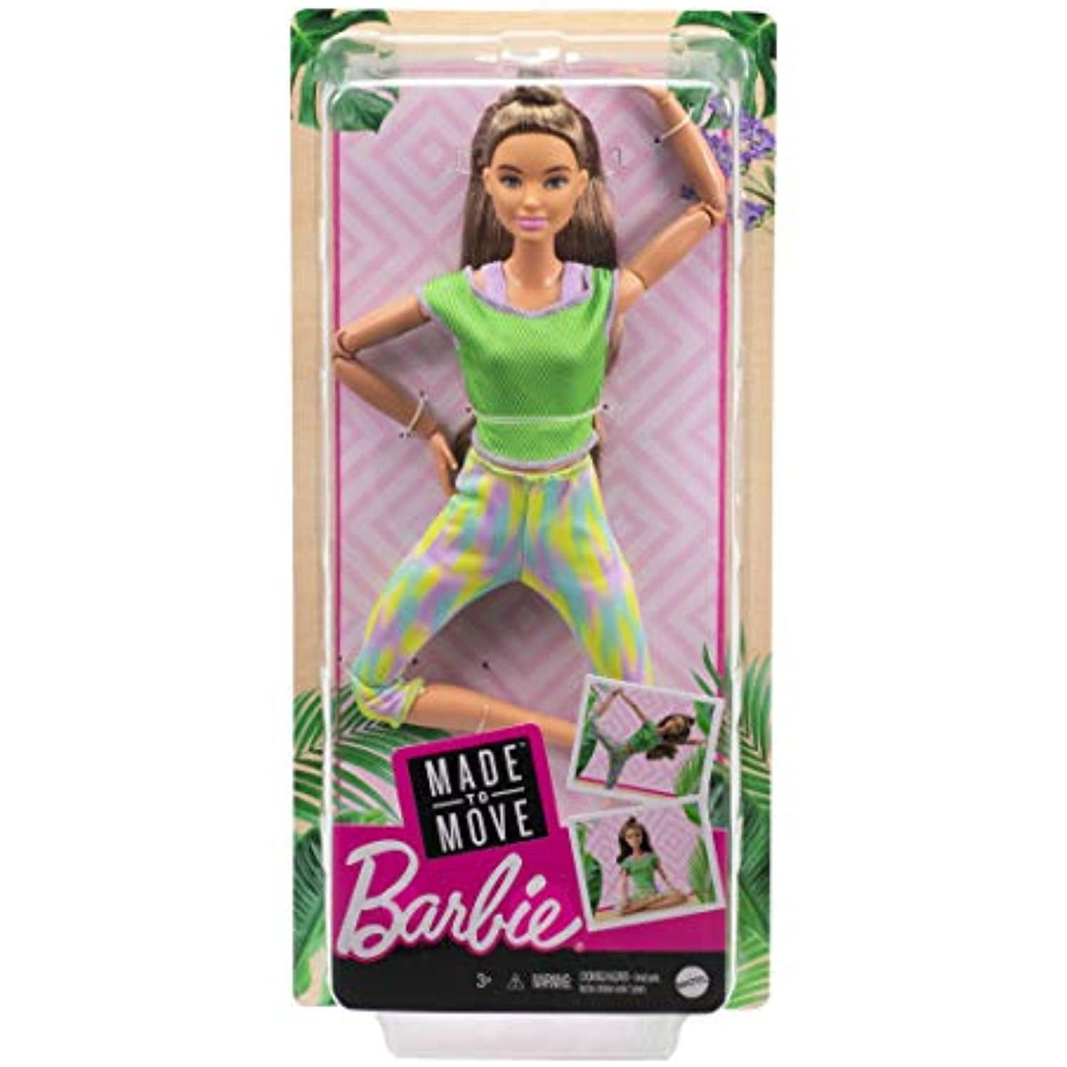 Barbie Made to Move Doll with 22 Flexible Joints Long Wavy Brunette Hair Wearing Athleisure-wear for Kids 3 to 7 Years OldKids can practice self-care as they help Barbie doll recharge -this extremely flexible doll allows them to play out movement and stillness.Barbie Made to Move doll has 22 "joints" -in the neck, upper arms, elbows, wrists, torso, hips, upper legs, knees and ankles -for lots of flexibility and a range of motion that mimics realistic action!A trendy mesh top and colorful yoga pants -with a cool teal, lime green and purple print -are perfect to go from workout to meditation to relaxation.Long brunette hair styled with waves and a top knot is a versatile look that encourages storytelling fun.Makes a great gift for kids 3 years and older, who can play out so many stories with the Barbie wellness dolls that inspire them to be good to themselves, too!