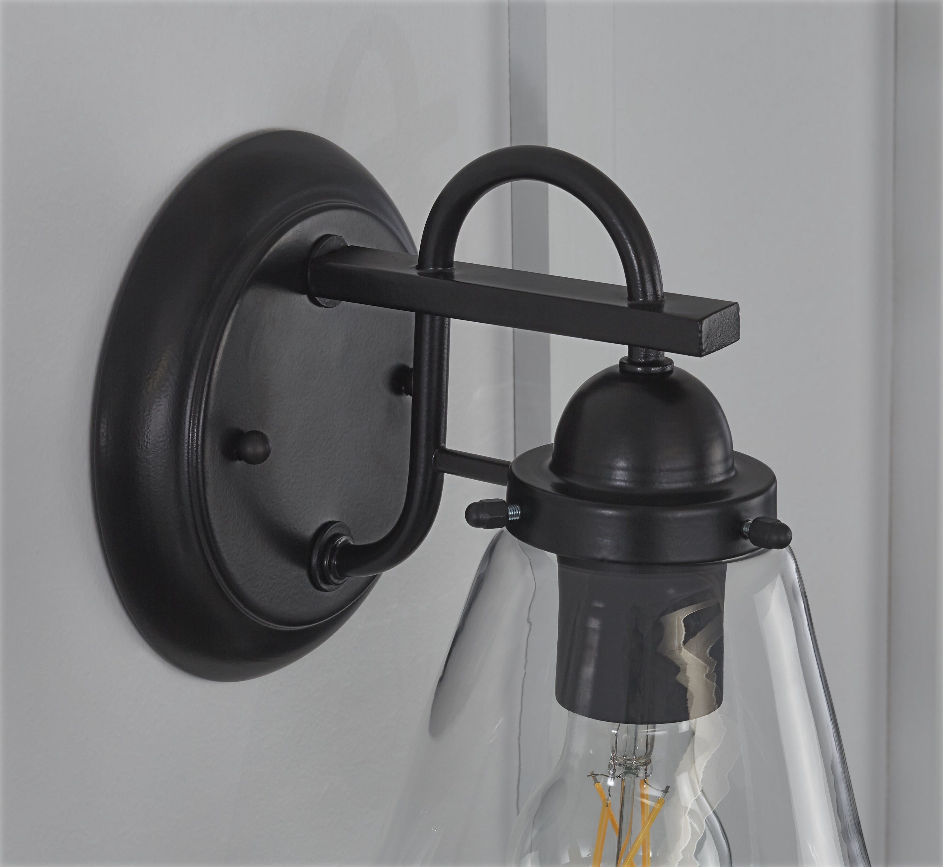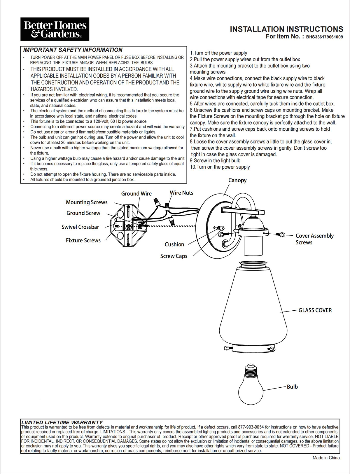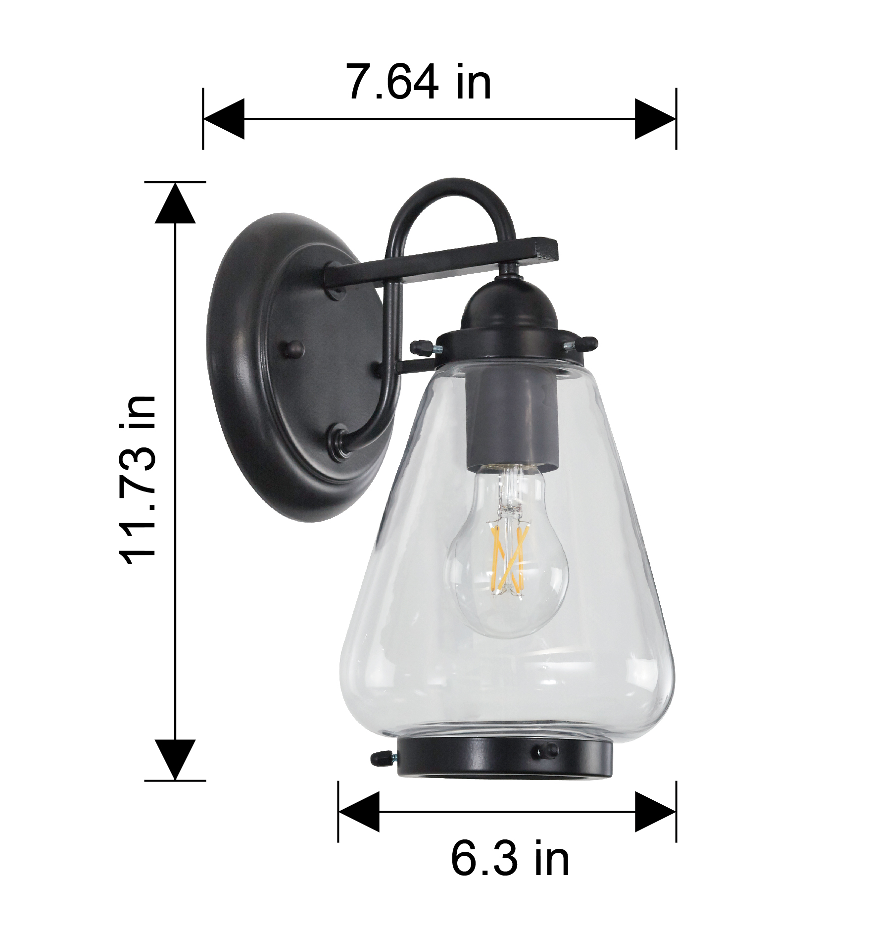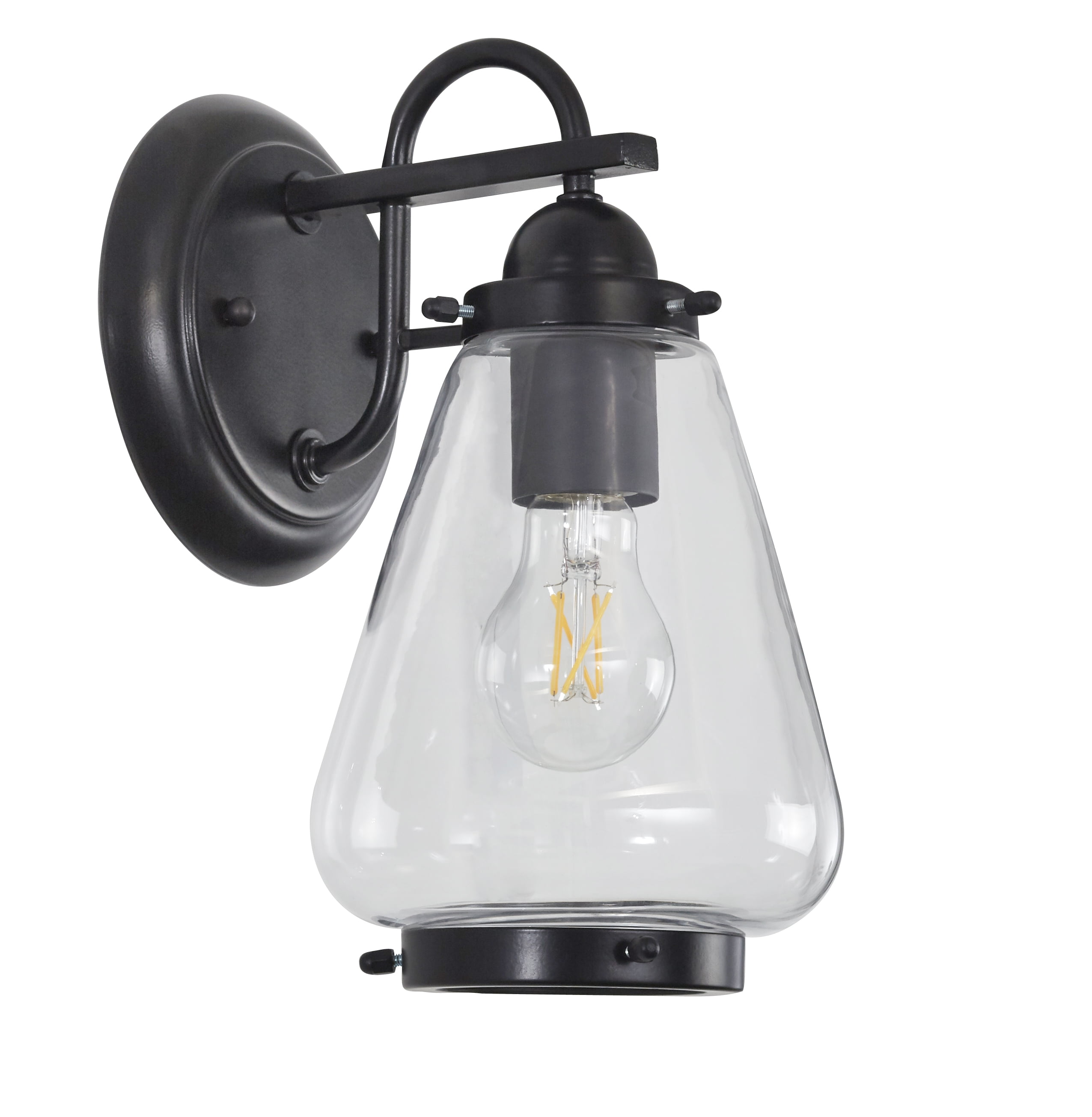 The Better Homes & Gardens fixture is well-design for your home decoration. The wall mount light has a clear pear-shaped glass. Which offers a contemporary style for a variety of exteriors. This metal light fixture features a matte black finish. This Better Homes & Gardens clear glass Wall Mount Light is a great decoration to your house. It is most suitable to be installed outside. This one-light wall sconce can beautify your living environment and illuminate for you and others. This fixture is equipped with a dimmable 40W equivalence A 19 filament bulb. This decorative bulb is rated to last 13 years based on 3 hours per day use. This light bulb uses only 5 Watt of energy to produce light, which is equal to light from a 40W incandescent that is a 90% savings over traditional lighting – and that means savings on your energy bill every month and with the energy certification to prove its credibility. 5 YEAR LIMITED WARRANTY – This product is warranted to be free from defects in material and workmanship 5 years after date of purchase. If a defect occurs, call 877-993-9054 for instructions on how to have defective product repaired or replaced free of charge. LIMITATIONS – This warranty only covers Better Homes & Gardens assembled lighting products and accessories and is not extended to other components, lamp bulbs or equipment used on product. Warranty extends to original purchaser of product. Receipt or other approved proof of purchase required for warranty service. NOT LIABLE FOR INCIDENTAL, INDIRECT OR CONSEQUENTIAL DAMAGES. Some states do not allow the exclusion or limitation of incidental or consequential damages, so the above limitation or exclusion may not apply to you. This warranty gives you specific legal rights, and you may also have other rights which vary from state to state. NOT COVERED – Product failure not relating to faulty material or workmanship, corrosion of brass components, reimbursement for installation or unauthorized service.