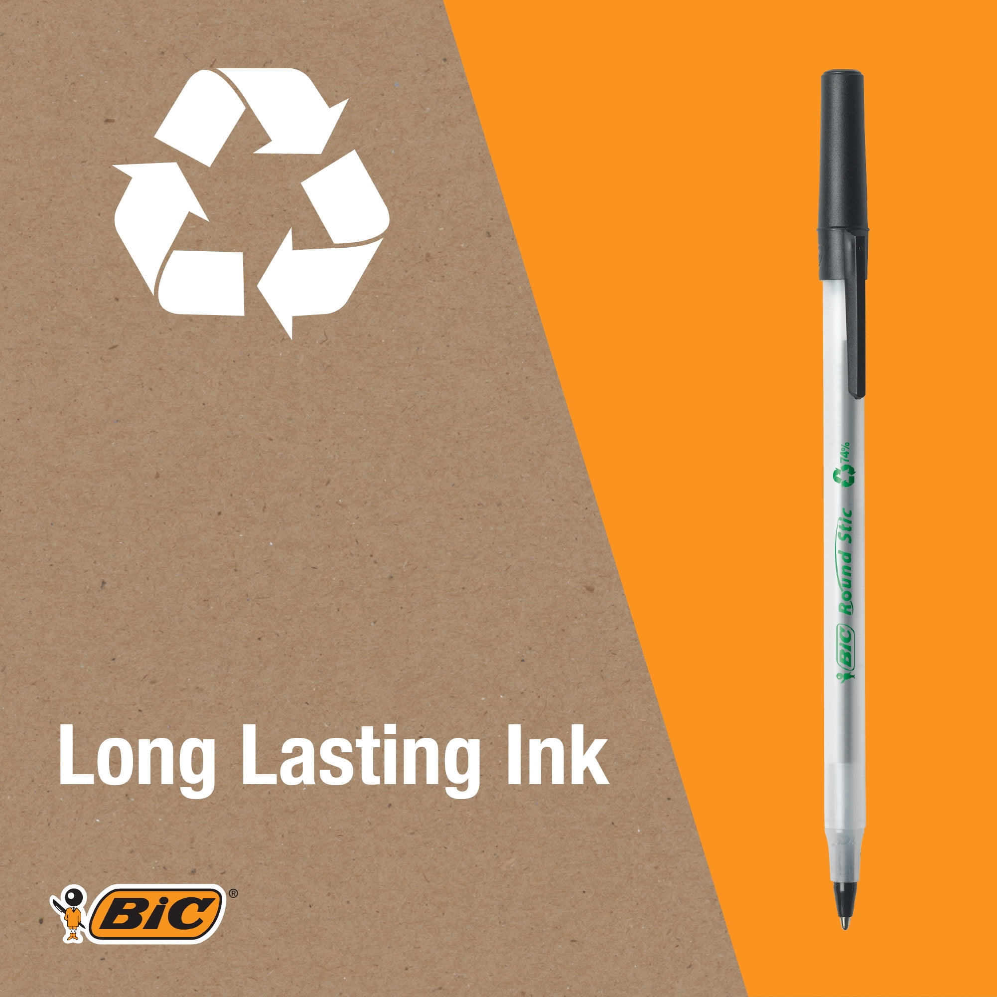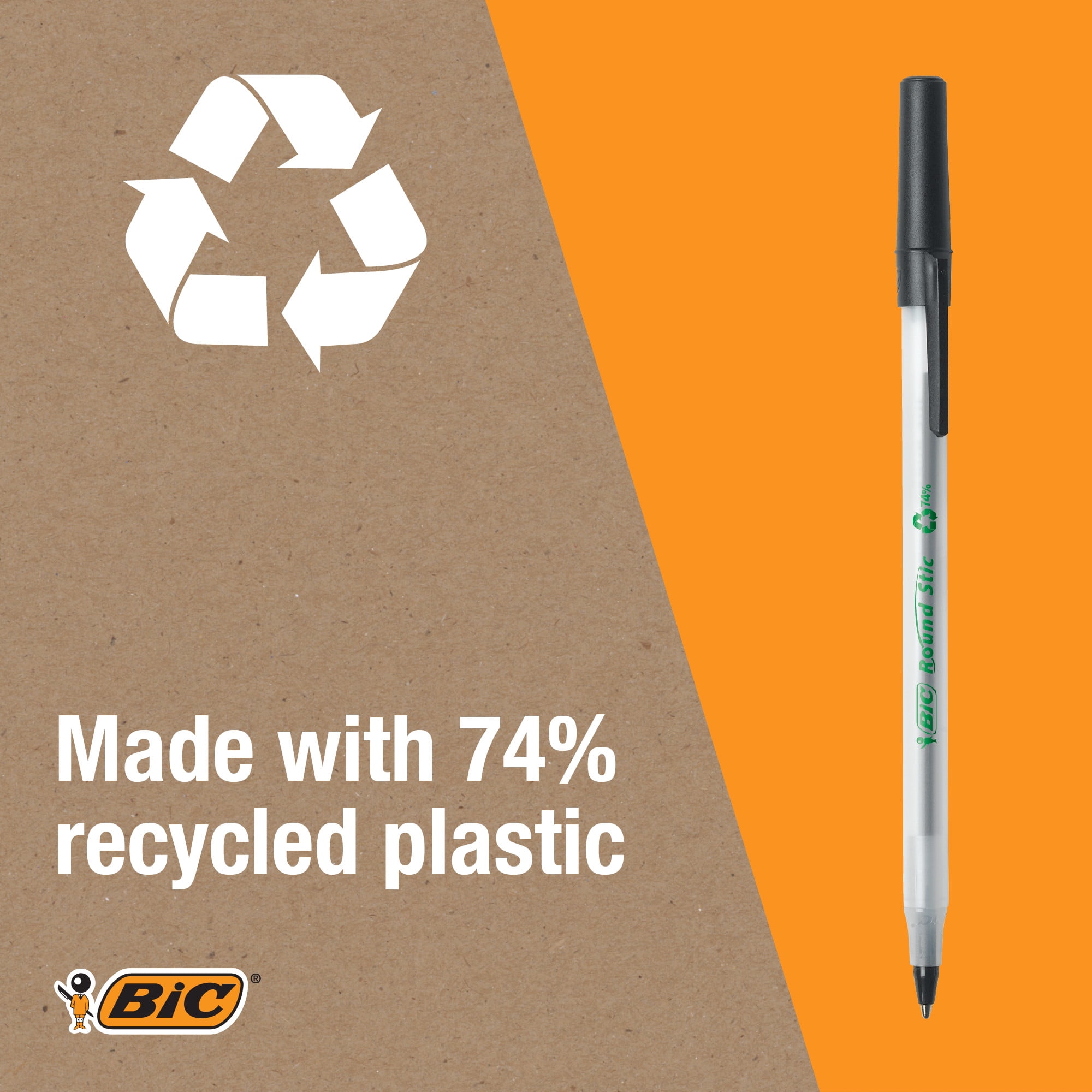 Made with 74 percent recycled plastic, the BIC Ecolutions Round Stic Ball Pen combines performance and recycled plastic into one writing instrument. This environmentally friendly pen features a versatile 1.0mm medium point that is ideal for almost any writing task. The translucent barrel lets you see the remaining ink supply, and the flexible round barrel is comfortable in the hand, even after hours of writing.