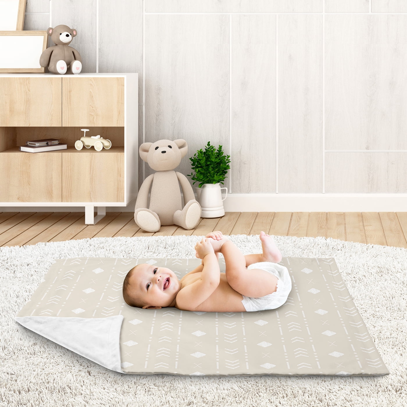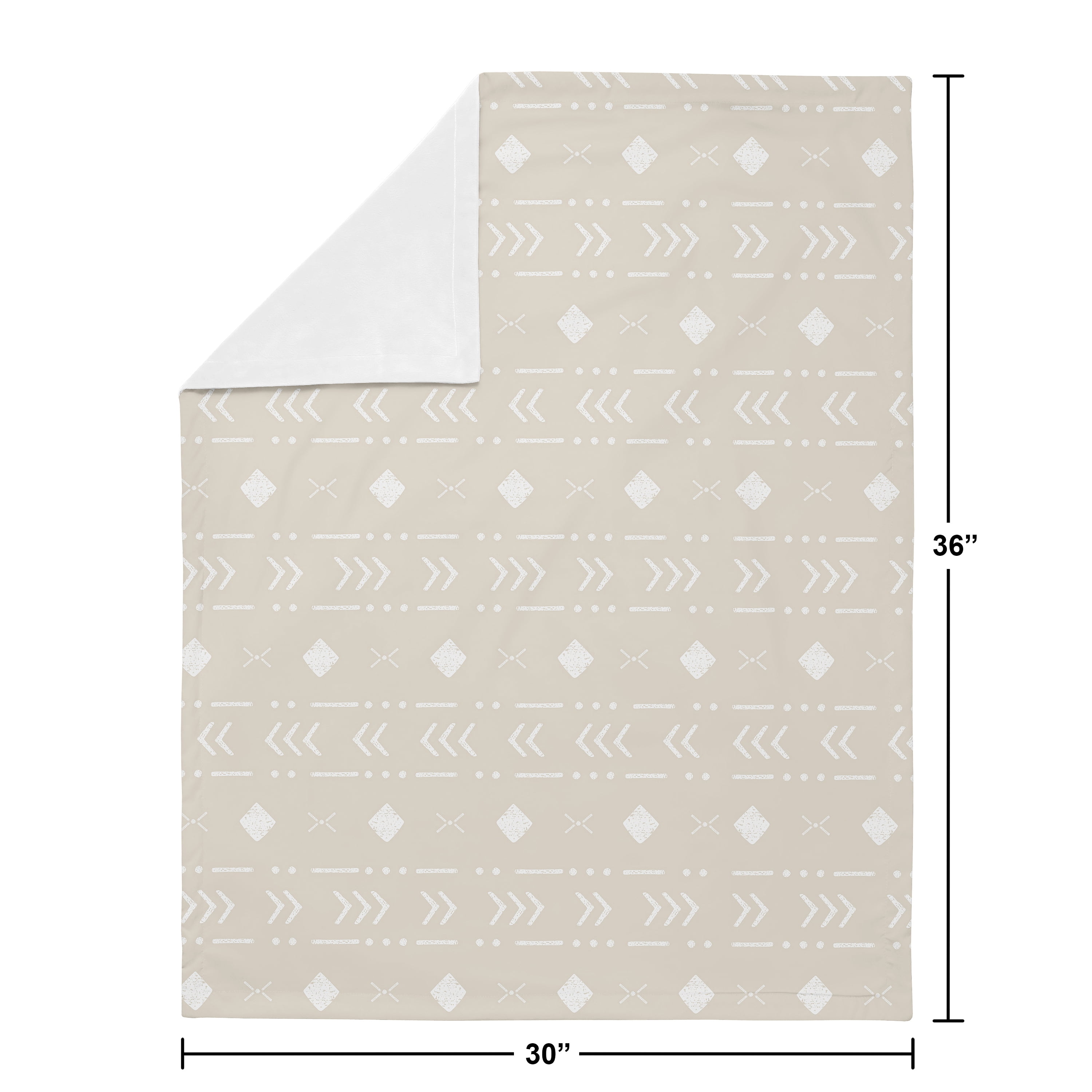 - Blanket is designed using a taupe and white boho aztec geometric brushed microfiber print and reverses to soft white minky