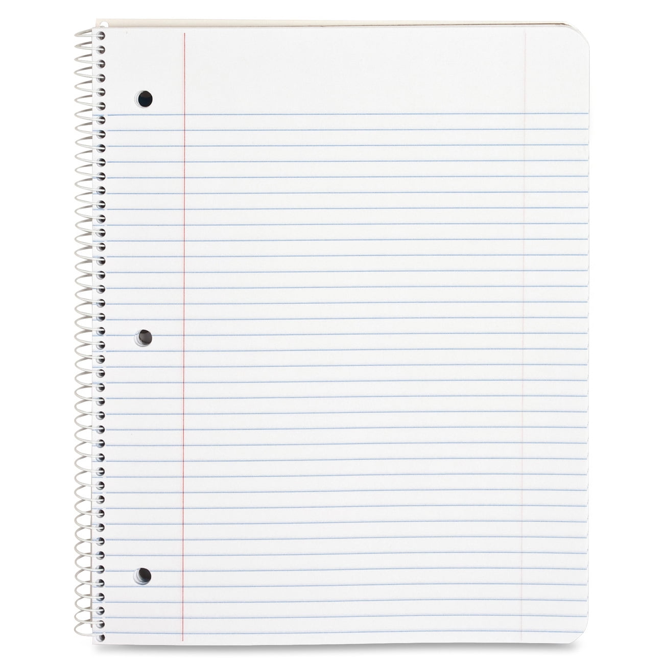 Single-subject punched notebook features a stiff cover and back for lasting protection and durability. Bright-white, 16 lb. sheets are college-ruled to keep your writing neat and organized. Spiral wirebound design lets you open up the notebook completely for easy handwriting. Three-hole punched notebook.