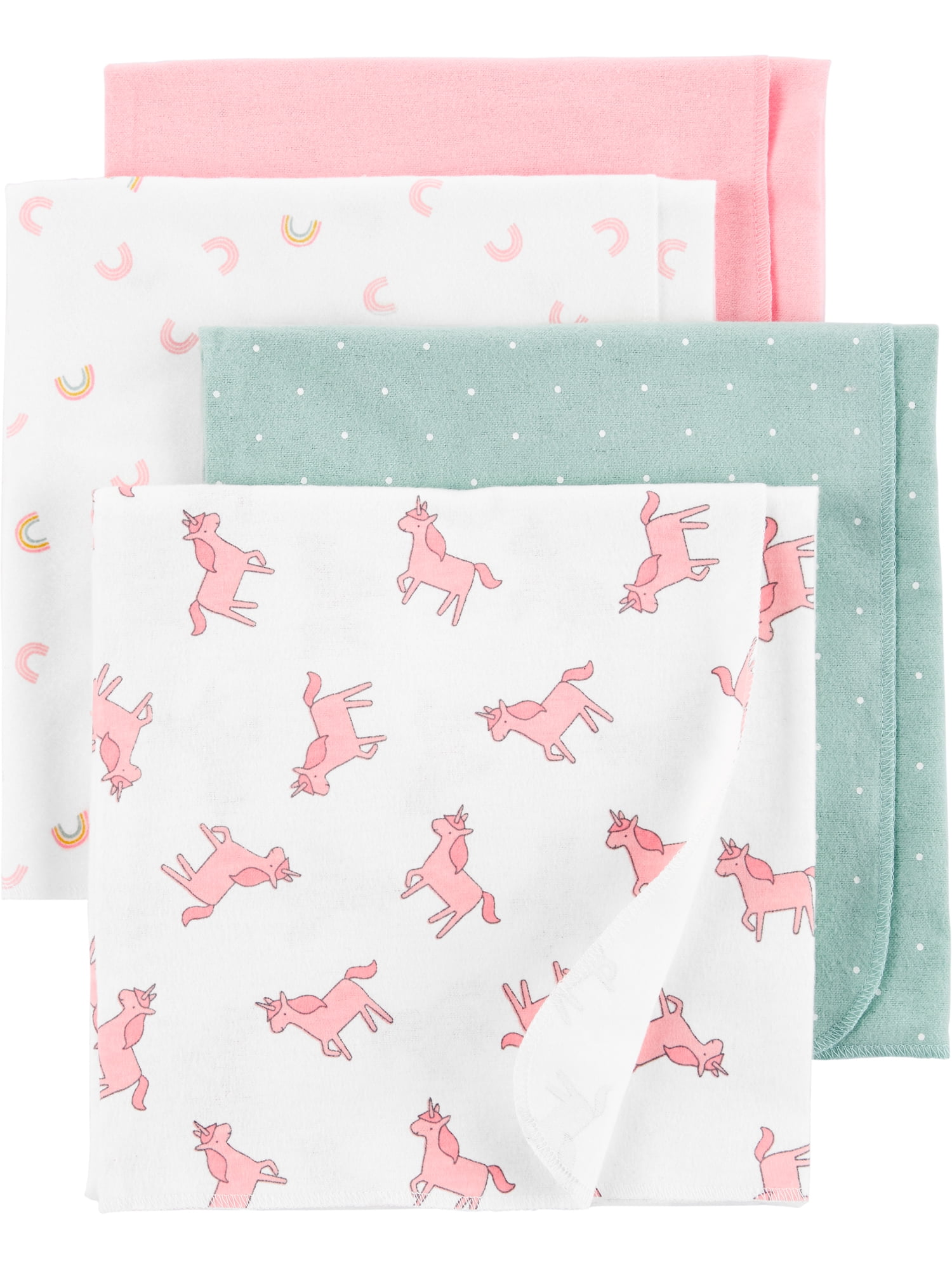 New styles, same great value. Fresh looks you’ll love made with the quality you trust from Carter’s. Keep baby oh so comfy and cozy in these super soft swaddle blankets from Carter’s Child of Mine. Perfectly sized for wrapping baby up, this four pack is made with sweet unicorn and rainbow prints for super cute style, plus soft brushed flannel for an extra cuddly feel.