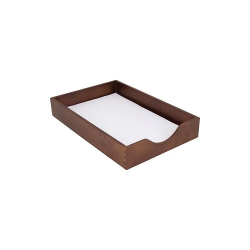 Desk tray features solid lock-corner construction and a walnut finish to enhance your office decor. Cutout in the front-loading tray offers easy access whether the tray is stacked with other trays to organize your paperwork. Wood desk tray requires a set of Carver supports for stacking.