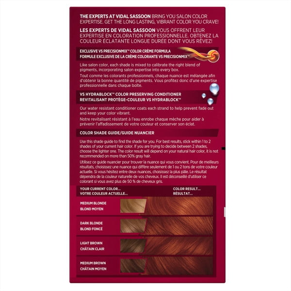 Get bold, beautiful permanent hair color mixed by color experts at Vidal Sassoon to calibrate the perfect blend of pigments; resulting in a bold; a beautiful color that lasts. Intense shades give you the chic fashion-forward look you want without a visit to the salon. Each side is mixed to calibrate the right blend of pigments, the result is precise with 100% gray coverage. The conditioner is water-resistant, and coats each strand to help prevent fade out and keep your color vibrant.