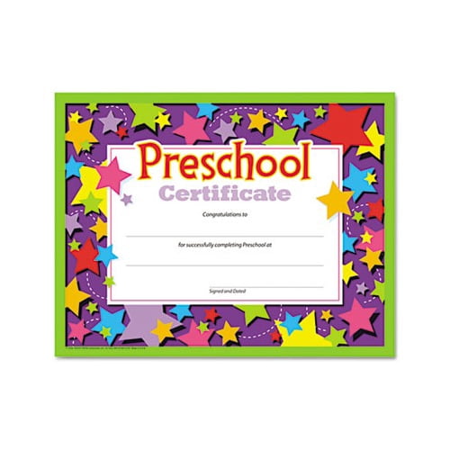 Recognize a child’s school experience Cheerful awards feature messages of belonging, accomplishment and celebration. Certificates are easy to personalize and printer compatible. Plus, they’re ready to frame, so children can quickly and easily display their achievement. Theme: Preschool Certificate Shape: Horizontal Rectangle Width: 11" Height: 8 1/2".