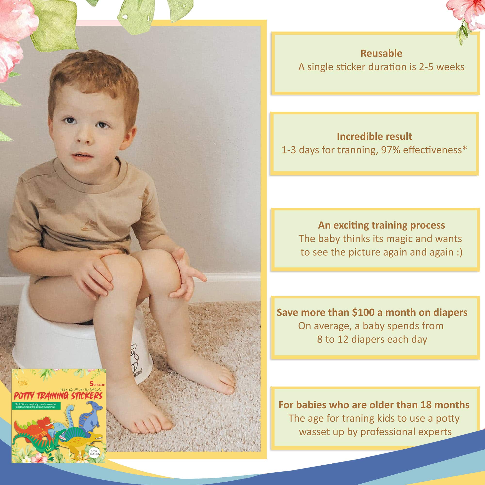 - Simplify the Learning Process: The "magic" potty training sticker is a simple way to keep kids engaged and motivated without relying on unhealthy sweets. It comes with a guidebook for expert advice. Children train in as little as 1-3 days.