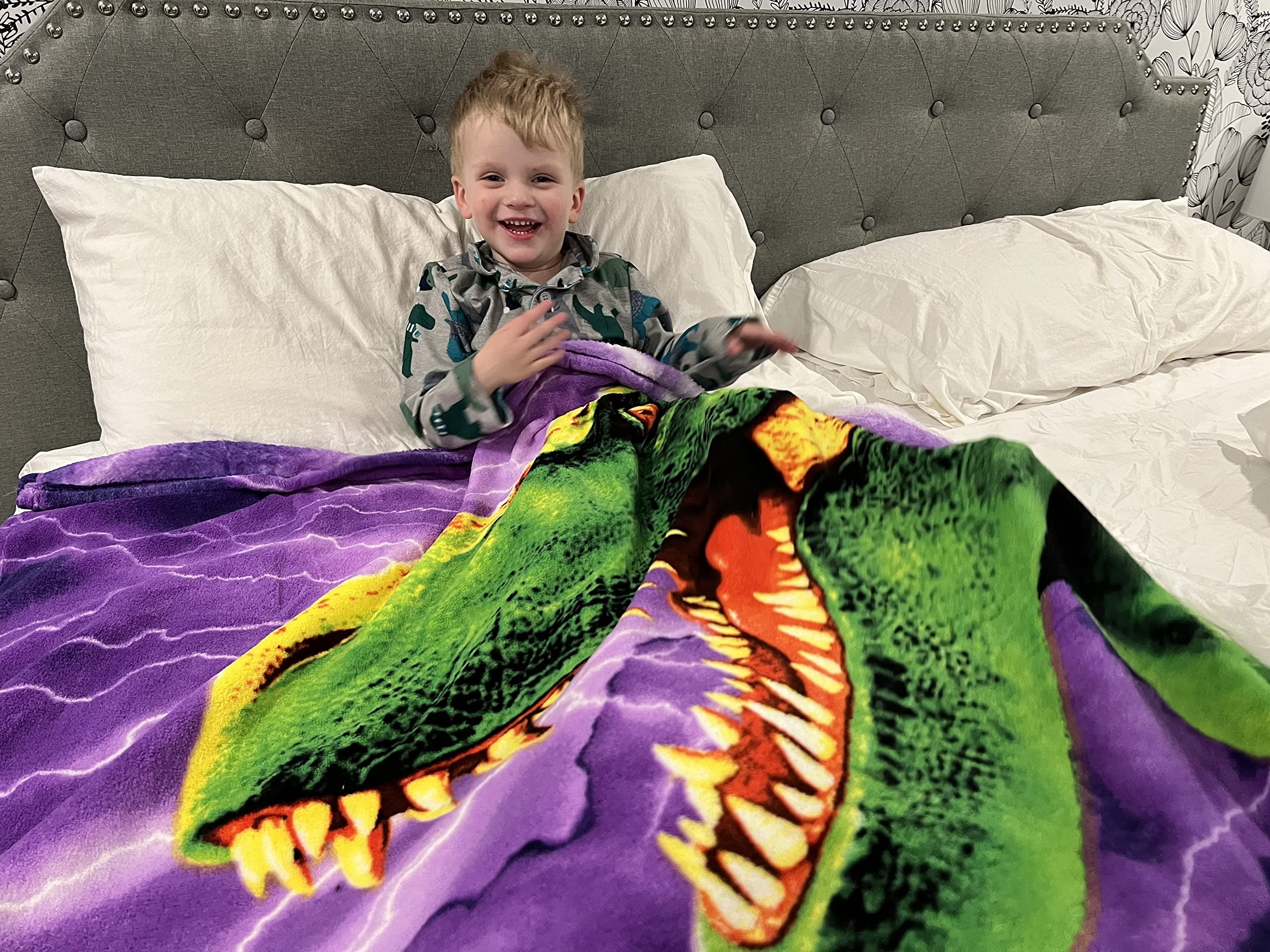 The T-Rex Fleece Blanket – This super soft, warm, and cozy, plush Dinosaur blanket is exceptionally durable. Snuggle up and keep warm with our eye-catching Dinosaur design!