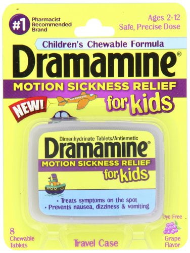 DetailsSafe, Precise DoseTreats symptoms on the spotGrape flavorTravel CaseLactose freeFor prevention and treatment of these symptoms associated with motion sickness:NauseaVomitingDizzinessDirectionsTo prevent motion sickness, the first dose should be taken 1/2 to 1 hour before starting activity. To prevent or teat motion sickness see below:Children 6 to under 12 years:Give 1 to 2 chewable tablets every 6-8 hoursDo not give more than 6 chewable tablets in 24 hours, or as directed by a doctorChildren 2 to under 6 years:Give 1/2 to 1 chewable tablets every 6-8 hoursDo not give more than 3 chewable tablets in 24 hours, or as directed by a doctor. Store at controlled room temperature 20-25C (68-77F)Dramamine Motion Sickness Relief for Kids, Grape Flavor, 8 Count