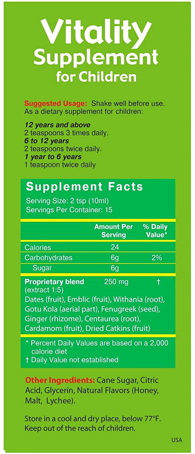 - KID-FRIENDLY FORMULA: Made with wholesome ingredients, Vitality Supplement contains Dates, Emblic, Withania, Gotu Kola, Fenugreek, Ginger, Centaurea, Cardamom, Dried Catkins and Natural flavors