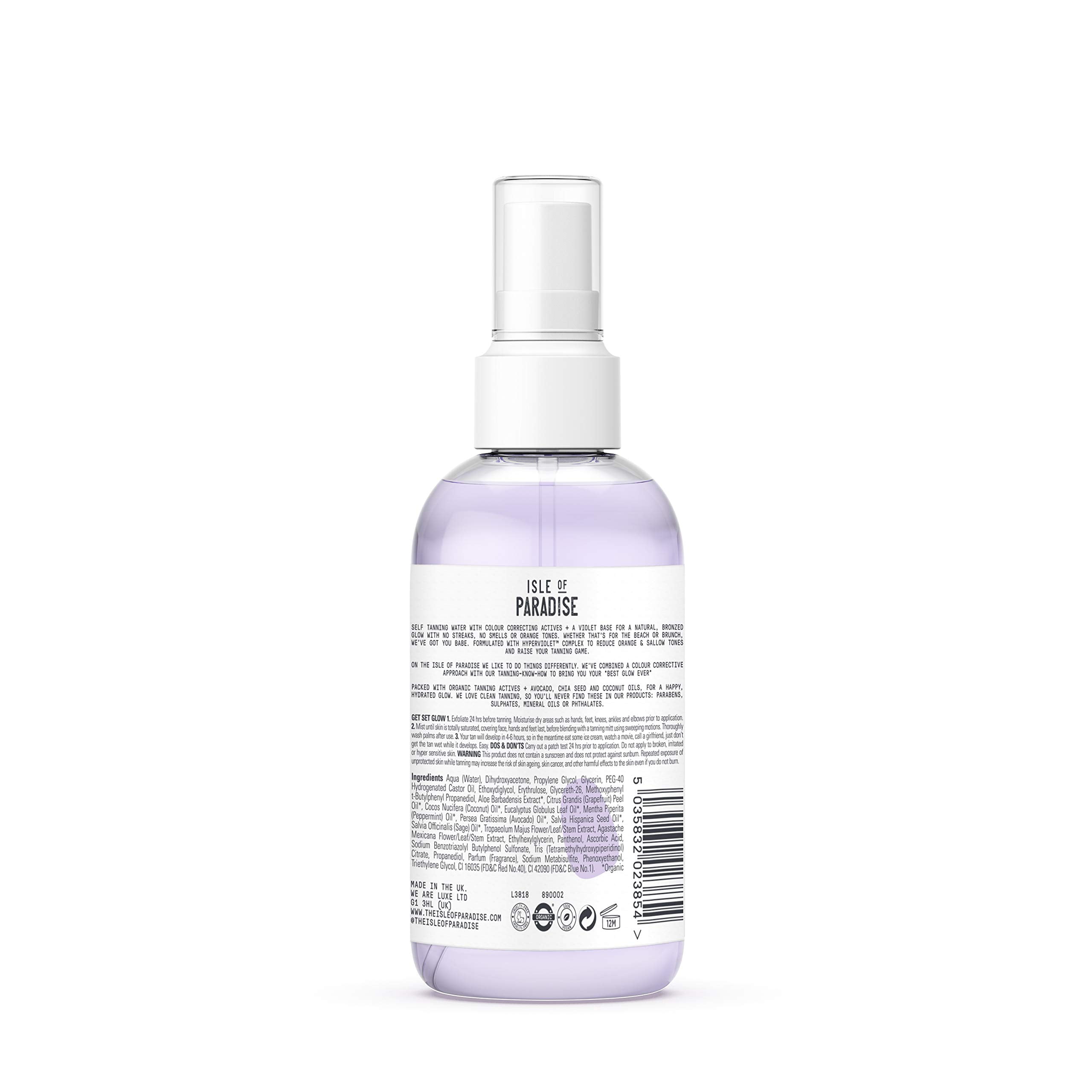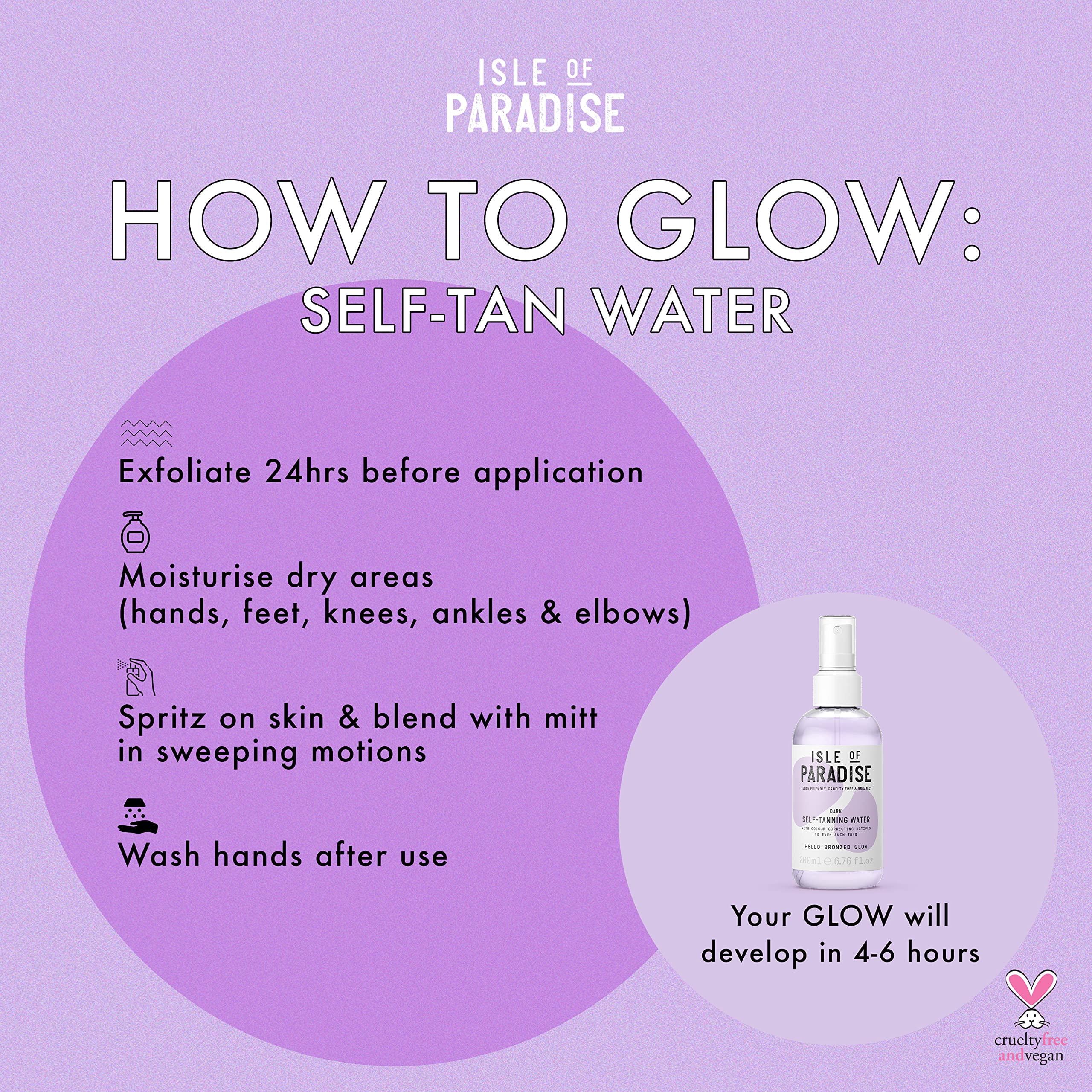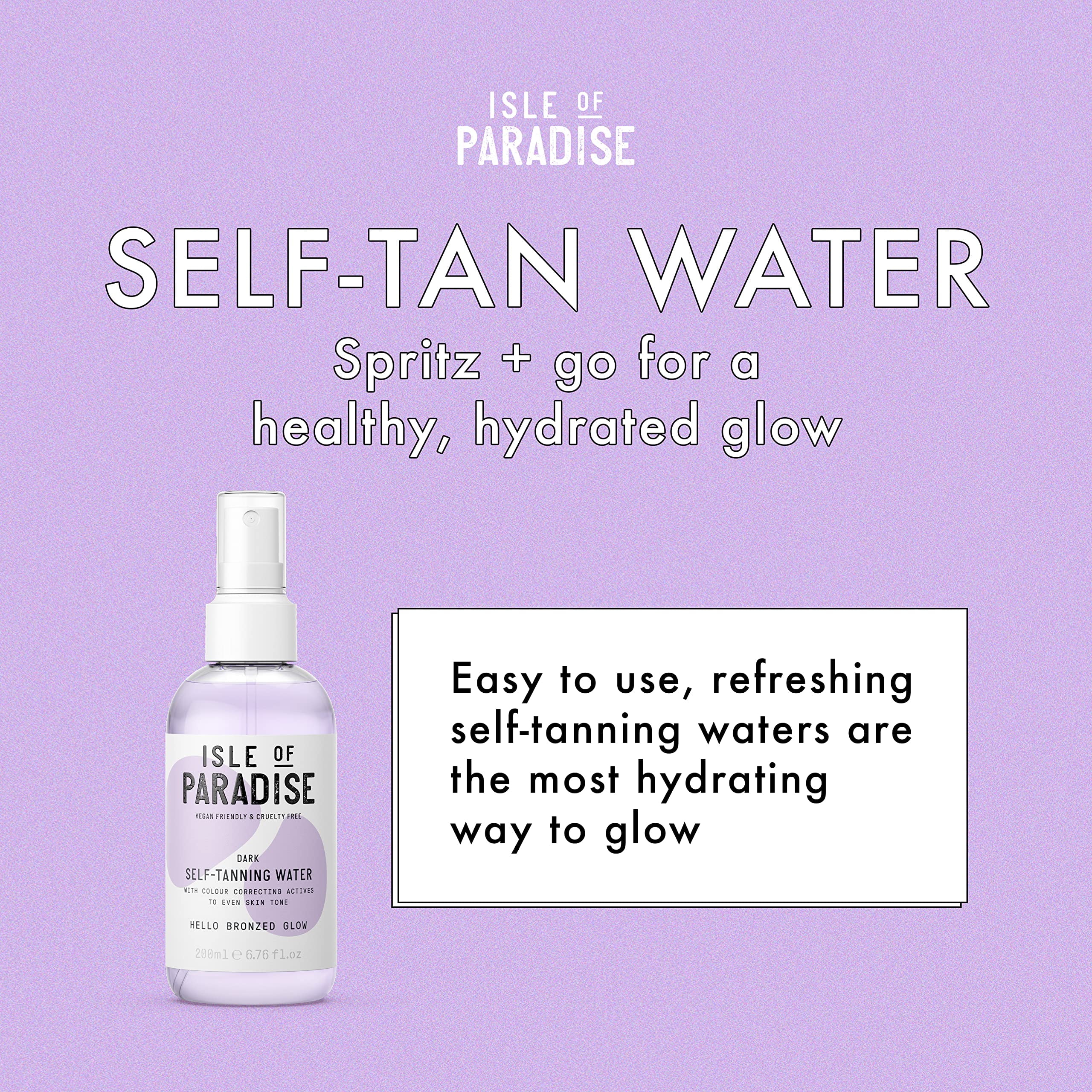 - Dark Self-Tanning Water for a natural looking fake tan with colour correcting actives plus Grapefruit, Chia Seed & Avocado Oils for an easy, hydrating spritz – like a drink of water for your skin!