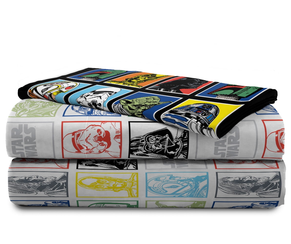 Get ready for an intergalactic adventure with this Star Wars Classic full sheet set featuring your favorite movie designs. Each 4 piece, super soft microfiber full sheet set includes a fitted sheet, flat sheet and two standard reversible pillowcases. The bold colors and exciting design will enhance the existing décor of any kid’s or toddler bedroom. Fitted sheet measures 54" x 75", flat sheet measures 81" x 96" with two 20" x 30" standard pillowcases. Decorative bedding features popular characters and icons from the movie. 100% polyester. Easy care, machine wash cold, tumble dry low.Star Wars Classic Grid 4 Piece Full Sheet Set, 100% Microfiber, White: