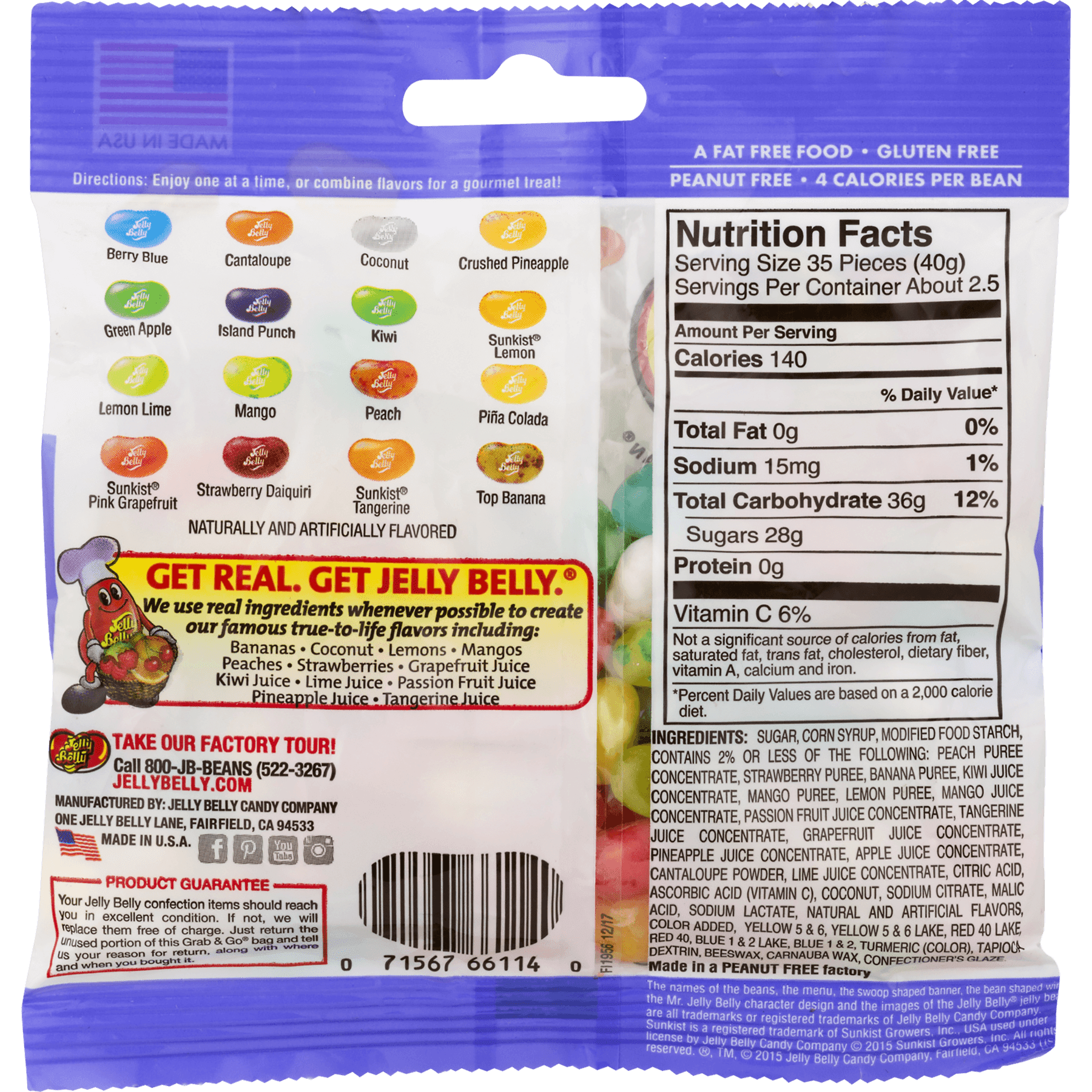 Reward yourself with a tasty treat with the Jelly Belly Jelly Beans Tropical Mix. It features a mix of 16 fruity flavors. These gourmet jelly beans come in a 3.5 oz bag, giving you plenty to share. At just 4 calories per bean and 140 calories per serving, they’re easy to add to your meal plan. The beans are free of dairy, peanuts, gluten and other irritants. They’re also kosher. Whisk yourself away to a tropical paradise with the Jelly Belly Tropical Mix. Tropical mix.Jelly Belly Jelly Beans Tropical Mix 3.5 oz:12-3.5 oz bagIncludes 16 of the most exotic flavors, including Pia Colada, Strawberry Daiquiri, Island Punch and Coconut0g fat per serving140 calories per serving4 calories per beanKosherGluten-free jelly beans are safe for people with CeliacPeanut-freeDairy-free