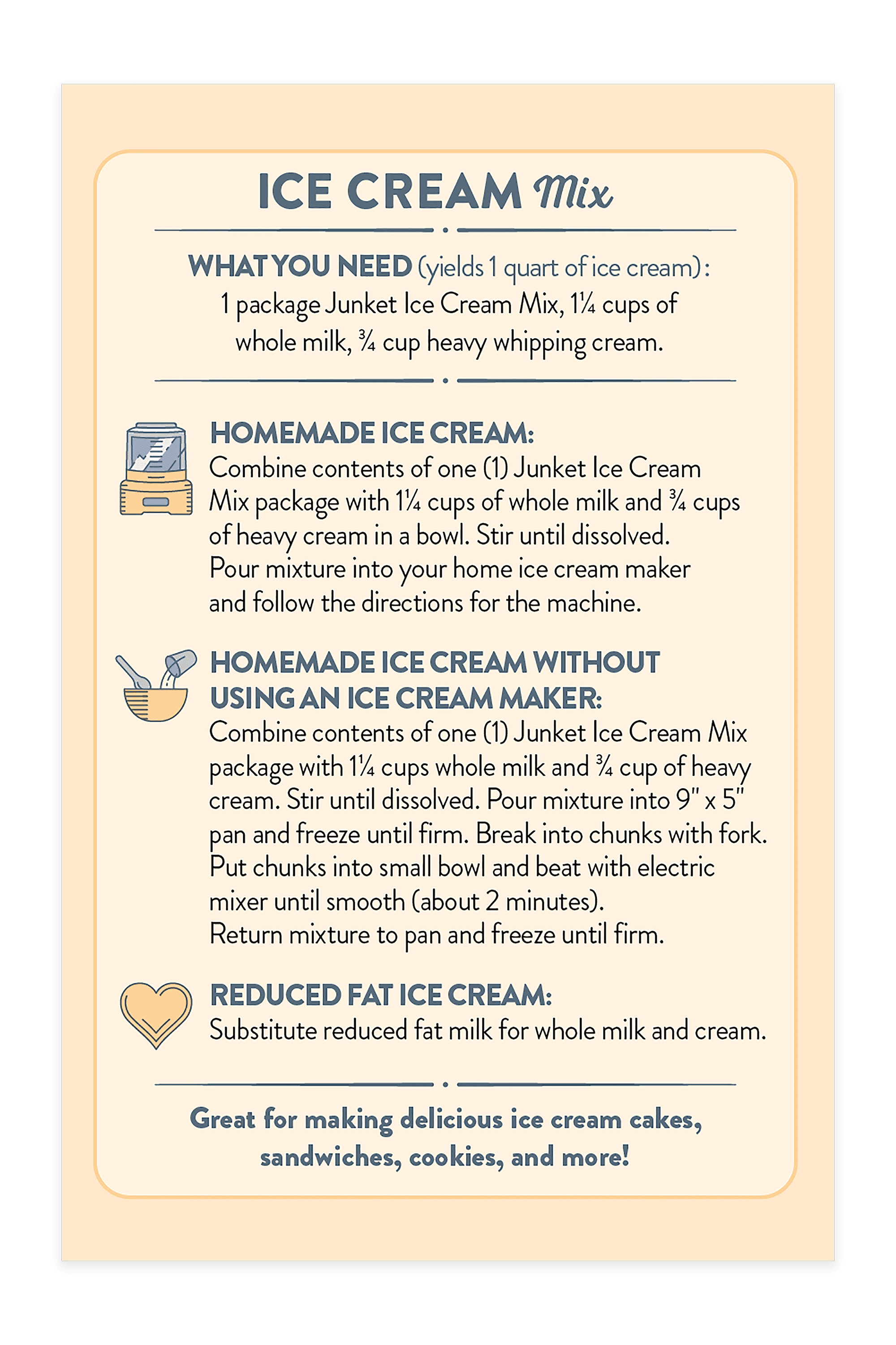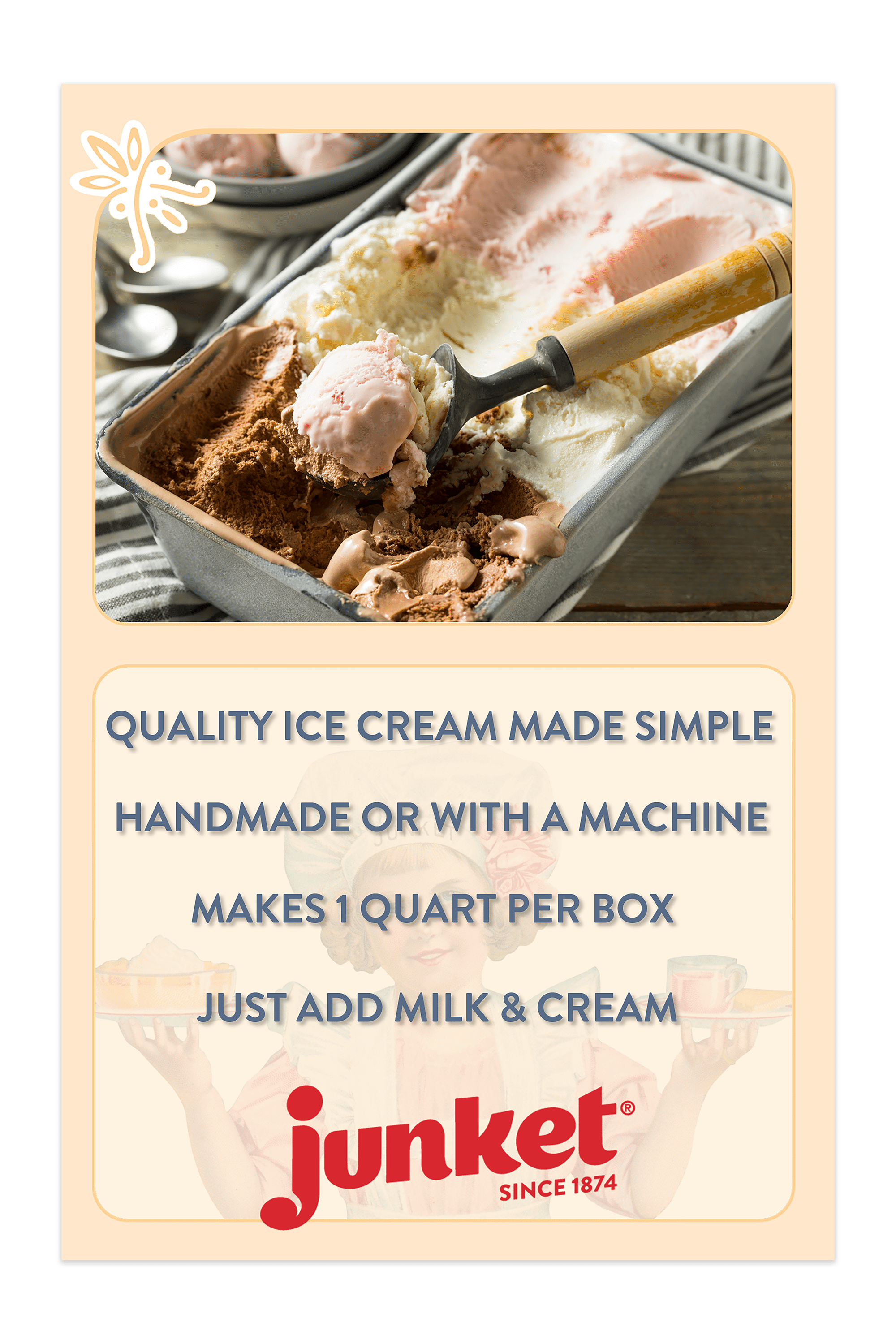 - SIMPLE TO MAKE: Custom, homemade ice cream is easy to make with Junket Ice Cream Mix. Just add milk and cream for one quart of satisfyingly smooth, flavorful ice cream the whole family will enjoy!