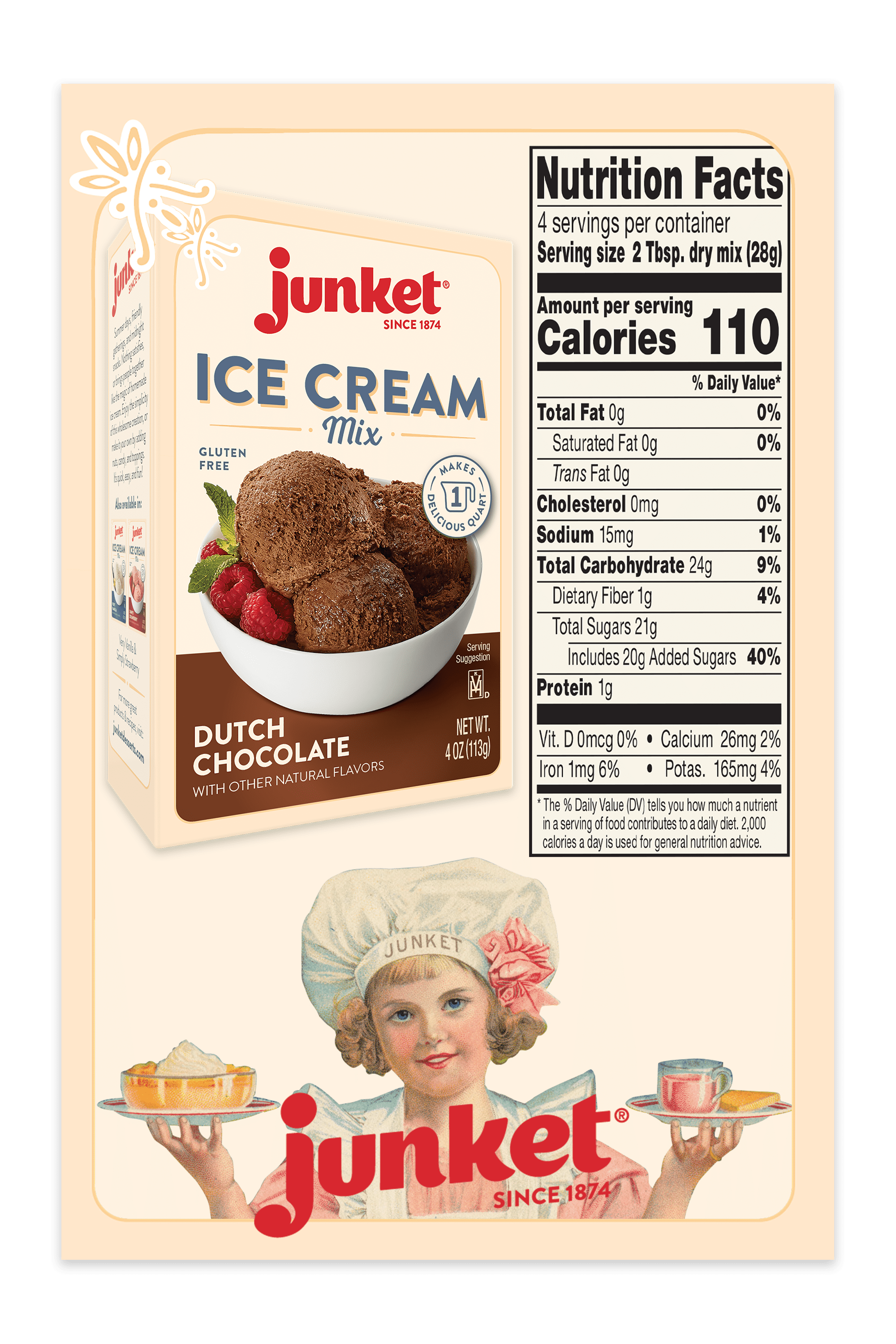 PREMIUM HOMEMADE ICE CREAM MIX Whether you’re enjoying a lazy summer day on the porch, a festive gathering of family and friends, or a simple after dinner snack, nothing delights like the magic of homemade ice cream cream. Enjoy the pure pleasure of delicious hand made ice cream anytime with Junket Premium Ice Cream Mix. DELIGHTFULLY DECADENT, RICH CHOCOLATE FLAVOR Made of wholesome, natural ingredients, Junket Dutch Chocolate mix has been used for generations to make quality, homemade frozen treats you’ll be proud to serve. Junket Dutch Chocolate Ice Cream Mix offers a rich, deep chocolate flavor in a smooth, creamy ice cream for a delightful treat the whole family will love! And Junket ice cream mixes are gluten free, too! Enjoy a perfect scoop alone, or savor Dutch Chocolate in scrumptious milkshakes, cakes, cookies, or smoothies! Dutch Chocolate also provides an excellent base to let your imagination run wild! Add candy, nuts, or other mix-ins, recreate your traditional favorites, or try new flavor combinations you create! SIMPLE TO MAKE, PREMIUM HOMEMADE ICE CREAM MIX Junket Ice Cream Mix includes all the starter ice cream powder you need to create amazing ice cream at home. Just add milk and cream, mix, and freeze for the most delectable ice cream you’ve ever tasted! Each pack of Junket Ice Cream mix makes 1 quart of delicious homemade ice cream, and is perfect for home ice cream machines or hand crank ice cream makers. Junket ice cream can also be made by hand, so you can enjoy premium, homemade quality even without an ice cream maker. JUNKET DESSERTS, QUALITY SINCE 1874 Junket has been supplying dessert makers with quality ingredients since 1874. The lineup includes the famous Rennet Tablets, Ice Cream Mixes, Danish Dessert fillings, and more. Headquartered in St. Louis, MO, Junket has returned to its family owned roots, emphasizing the tradition and quality of the Junket brand.