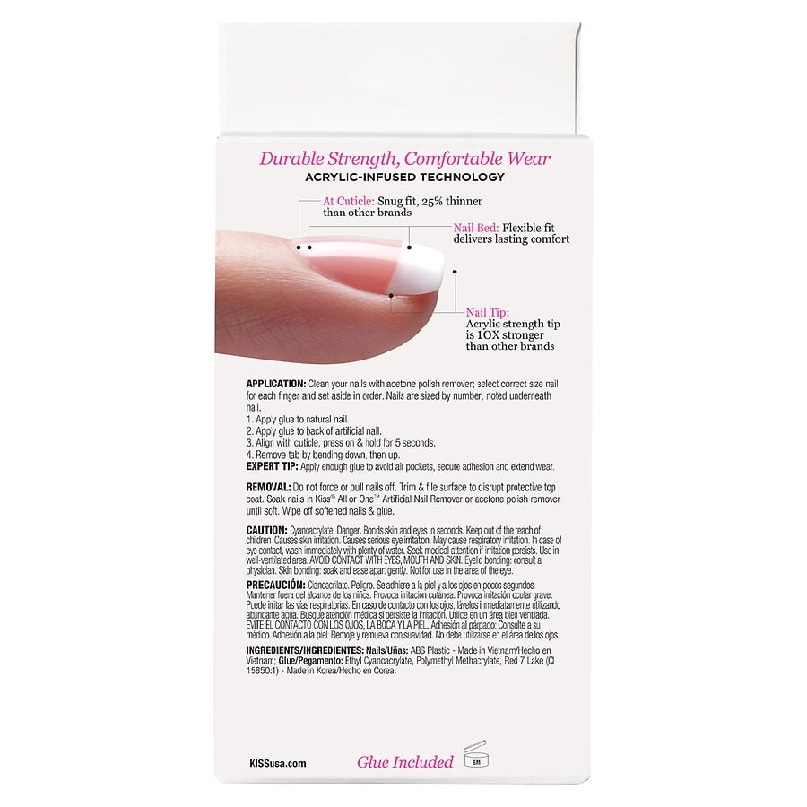 The look and strength of salon acrylics that a professional tediously sculpts onto the nails with a brush, but these glue on in minutes. Acrylic-infused technology makes the nails super durable and they never chip! Kit contains 28 Nails, Pink gel glue (2g), Mini file, Manicure stick. Wears for up to 7 days.Clean nails with nail polish remover and wash hands thoroughly with soap; select correct size nail for each finger and set aside in order. Nails are sized by number, noted underneath nail. ADHESIVE TABS: Nails and Adhesive tabs have sizes. Select tab that coordinates with selected nail size & peel off sheet. Apply tab to natural nail, press & smooth; peel off film. Align nail with cuticle and press down firmly in the middle, then on each side. Press nails down several times; avoid contact with water for the first hour. REMOVAL: Apply polish remover around edges, wait 1 minute and gently peel off nail from sides. GLUE: Apply glue to back of artificial nail.