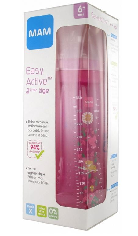MAM Easy Active 2nd Age 330ml Bottle 6 Months and + – Color: Pink 2 suits babies from 6 months and over. Developed with scientific and medical experts, the MAM baby bottle has a silicon teat with a unique texture -the Silk teat-, that facilitates the transition breast / baby bottle, for the baby. Soft and supple, its is familiar to baby who easily accepts the teat. Its flow is ideal for thick liquids, adapted to babies over 6 months. Made with plastic, it is unbreakable. Design, its shape is ergonomic, fostering the grip for baby. 0% BPA.Baby bottle-Baby Equipement