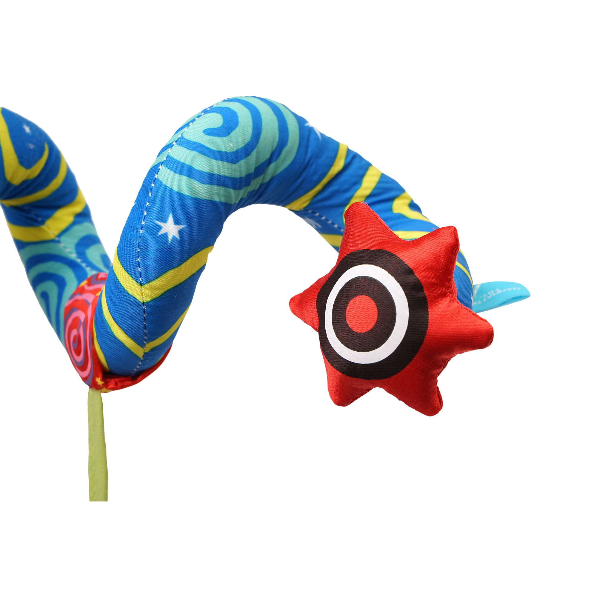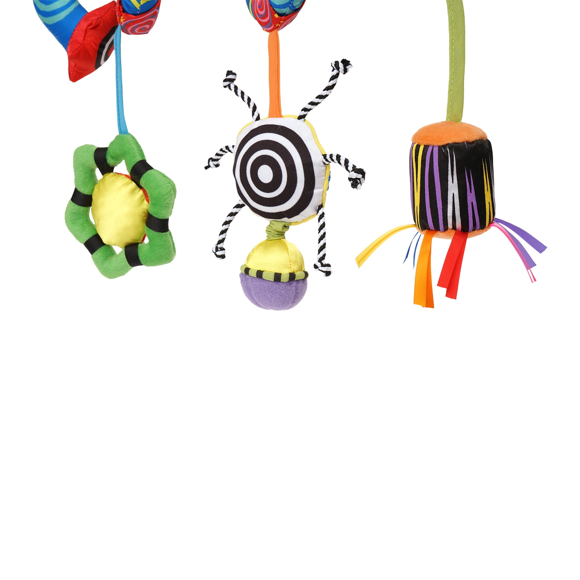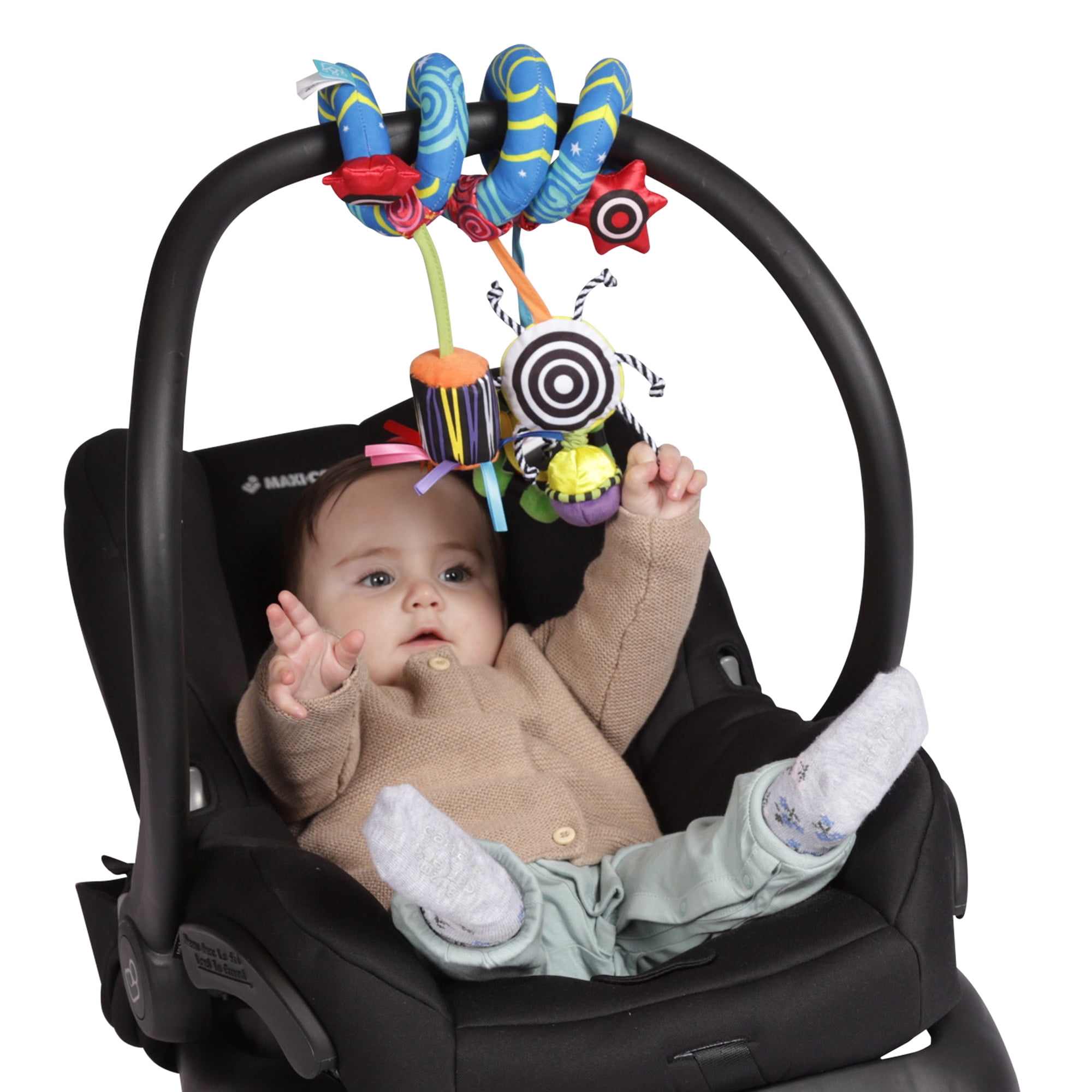 - SPIRAL STROLLER AND TRAVEL ACTIVITY TOY: From crib toy, car seat toy to stroller toy, this wacky spiral makes it easy to attach to most everything with a bar or rail. Surface wash fabric only.
