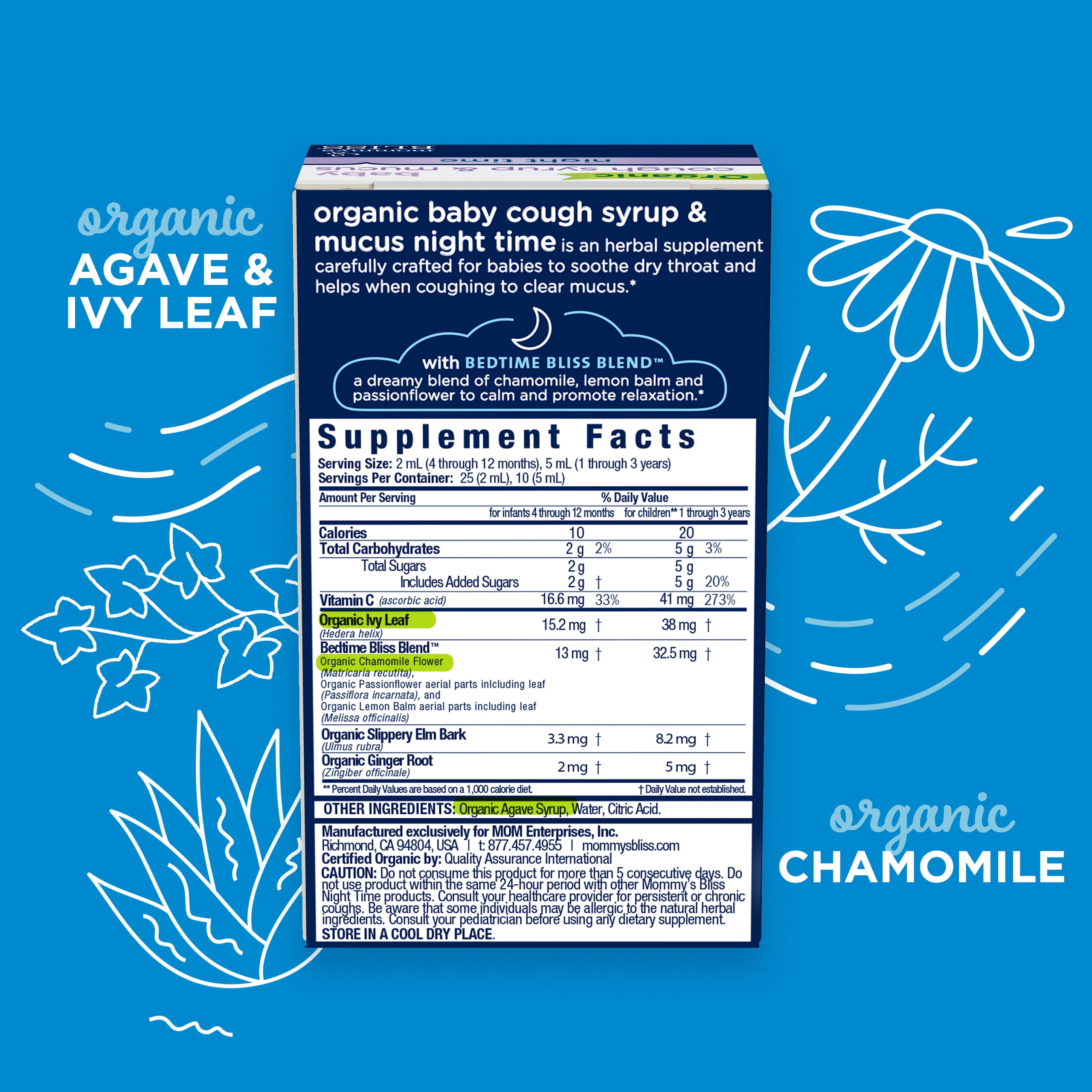 Contains 1-4 fl oz bottle of Mommy’s Bliss Organic Night Time Cough Syrup with dispensing cup (recommended for kids 1 year and up).