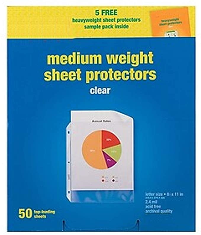 Medium Weight Sheet Protectors, Clear, 50/Box (10519-CC). Sheet protectors to prevent degradation of paper inserts. Clear polypropylene material provides easy viewing. Three-hole punched and ready for use. 50 per box. Sold as 50/Box.