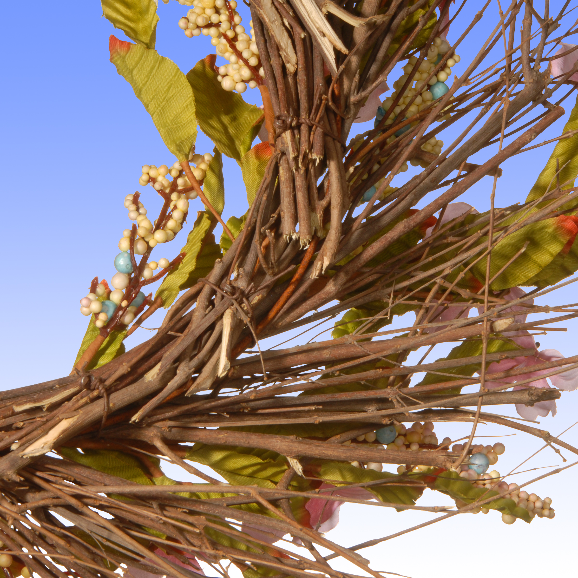 This wreath features a swirl of wood branch tips dotted with blooms of pink dogwood flowers. Mixed in are leafy greens and berry clusters for added natural appeal. Display this rustic decorative piece on doors, walls and windows in indoor or covered outdoor locations.