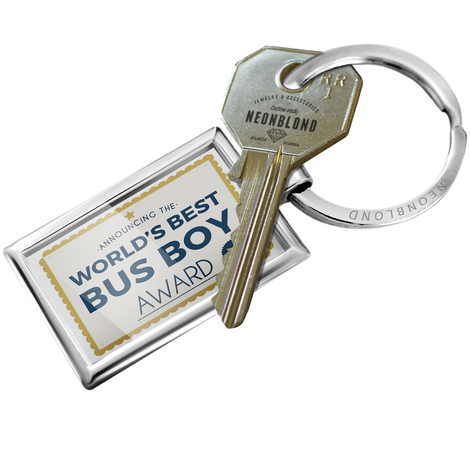 NEONBLOND’s key chains / key rings are a unique and perfect gift, ideal for house and car keys. You need a Black Friday Stocking stuffer or a Christmas Gift? We have more than 90,000 different keychain products all assembled the USA! Standard Size measures approximately 3" X 1", including key ring Money-back Satisfaction Guarantee Made in Atlanta ,GA.NEONBLOND Keychain Worlds Best Bus Boy Certificate Award