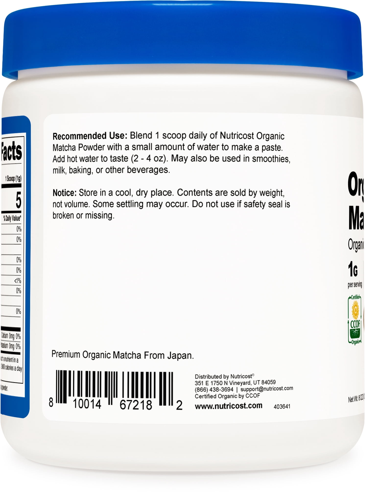 Nutricost uses Organic Matcha powder (Culinary Grade) that is sourced directly from Japan. It contains approximately 227 servings in each bottle. Each serving contains 1 gram of organic culinary grade matcha powder. This product is non-gmo, gluten free, vegetarian friendly, and has been certified Organic by CCOF. Nutricost, located and headquartered in the USA, only uses the best ingredients to ensure maximum quality and to help you feel your best! By keeping our supplement recipes simple and clean, you get the best experience possible with Nutricost. Our supplements are manufactured in a GMP-compliant and FDA-registered facility; and each batch of every product is tested by independent, ISO-accredited laboratories. These statements have not been evaluated by the Food and Drug Administration. This product is not intended to diagnose, treat, cure, or prevent any disease.