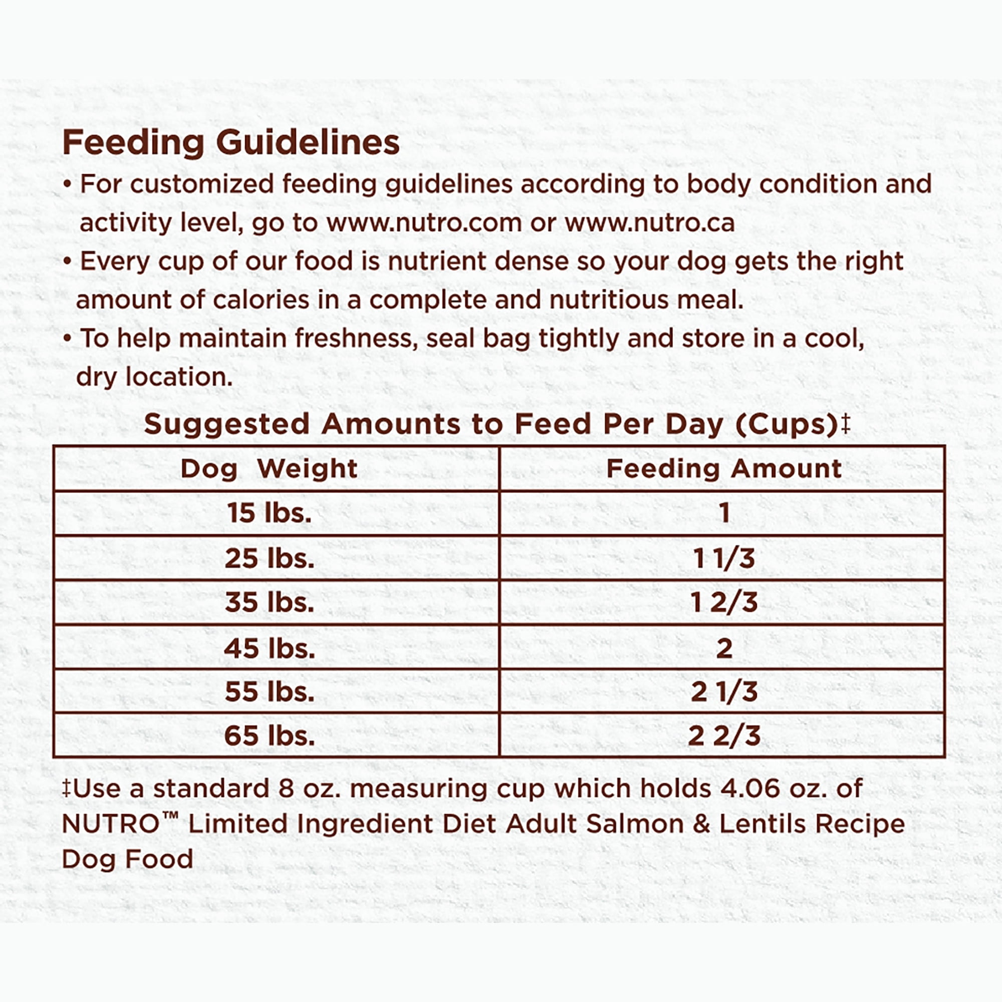 NUTRO Limited Ingredient Diet Adult Dry Dog Food Salmon and Lentils is made using 10 key ingredients or less plus natural flavors, vitamins minerals and other nutrients. These dry dog food recipes avoid ingredients that commonly cause food sensitivities in pets, like chicken, beef, corn, wheat, soy and dairy protein. Prepared with high-quality Salmon and lentils, this grain-free dog food not only tastes great, but it also nourishes sensitive skin for a soft and shiny coat –– guaranteed or your money back. NUTRO Limited Ingredient Diet Food for Dogs also follows the NUTRO FEED CLEAN philosophy, is always made with Non-GMO* Ingredients and is made with no artificial flavors, colors or preservatives. * Trace amounts of genetically modified material might be present due to potential cross contact during manufacturing.