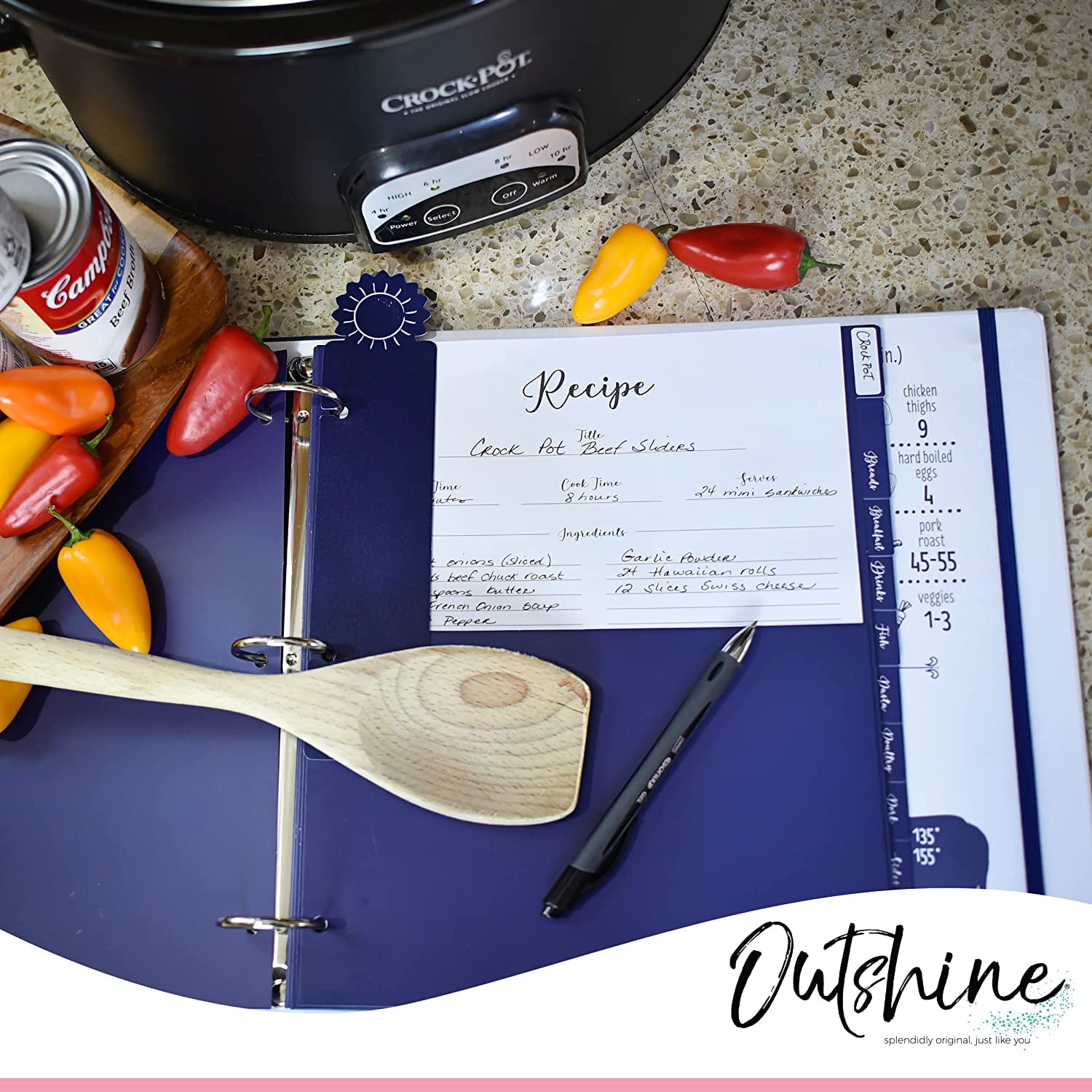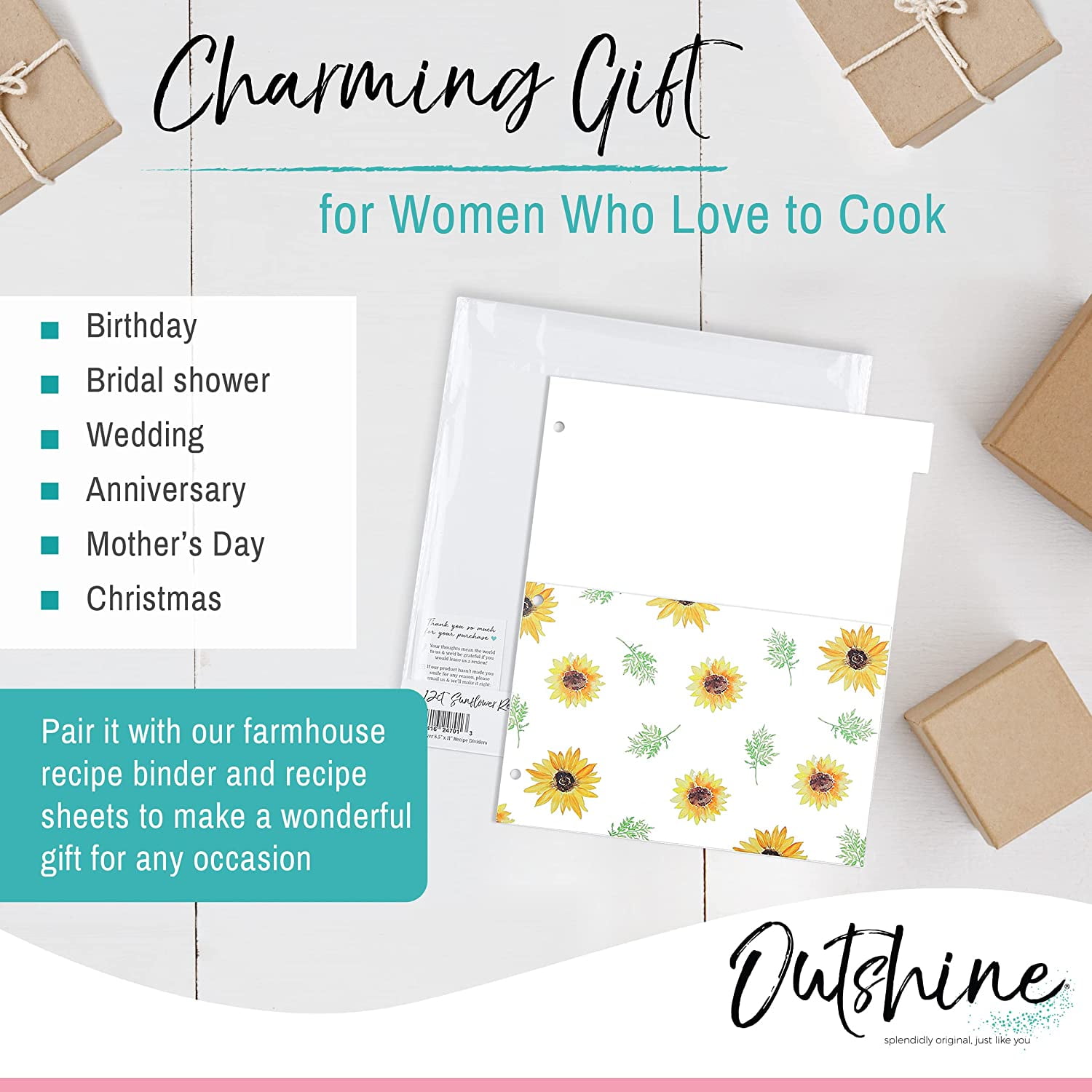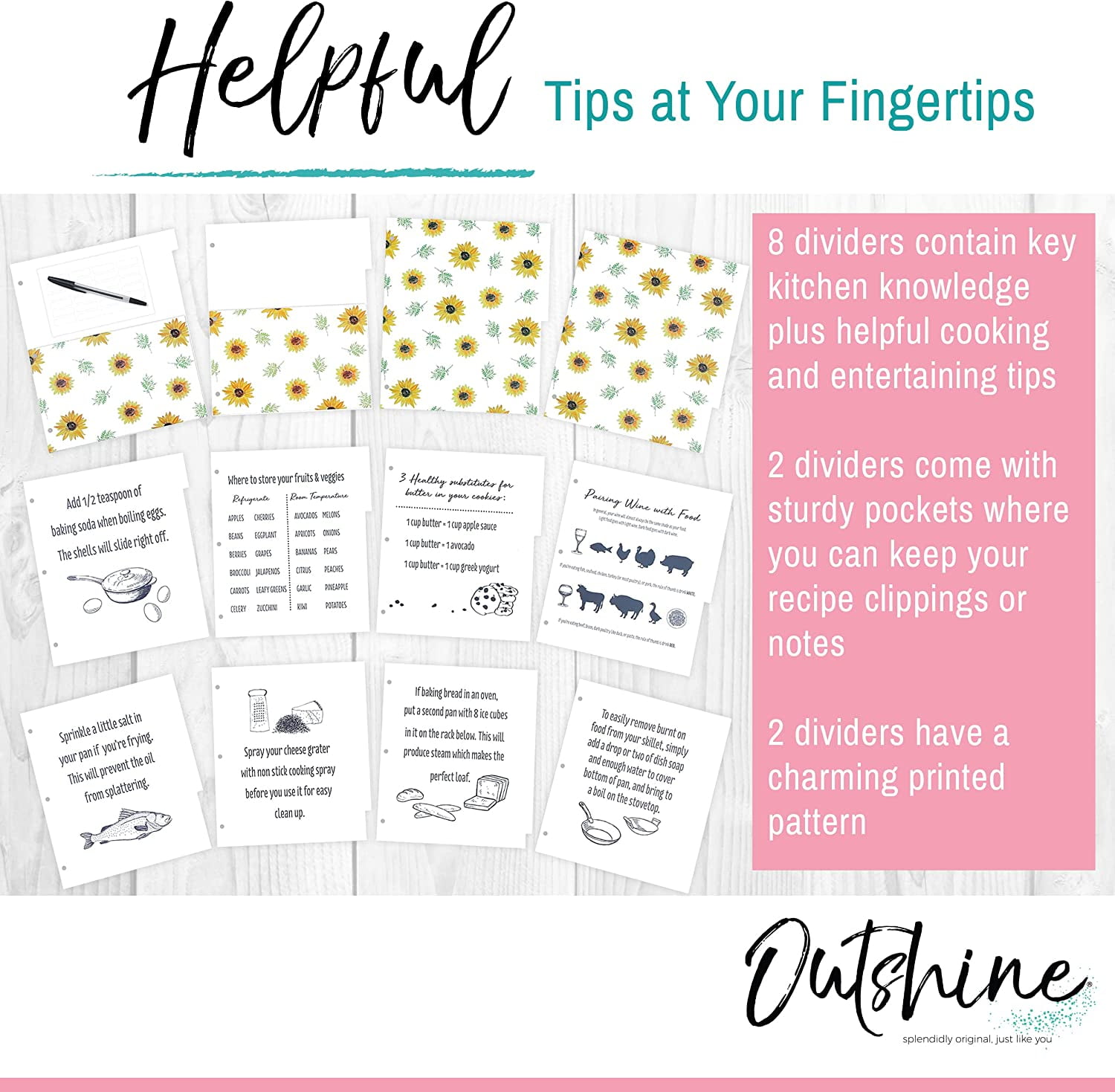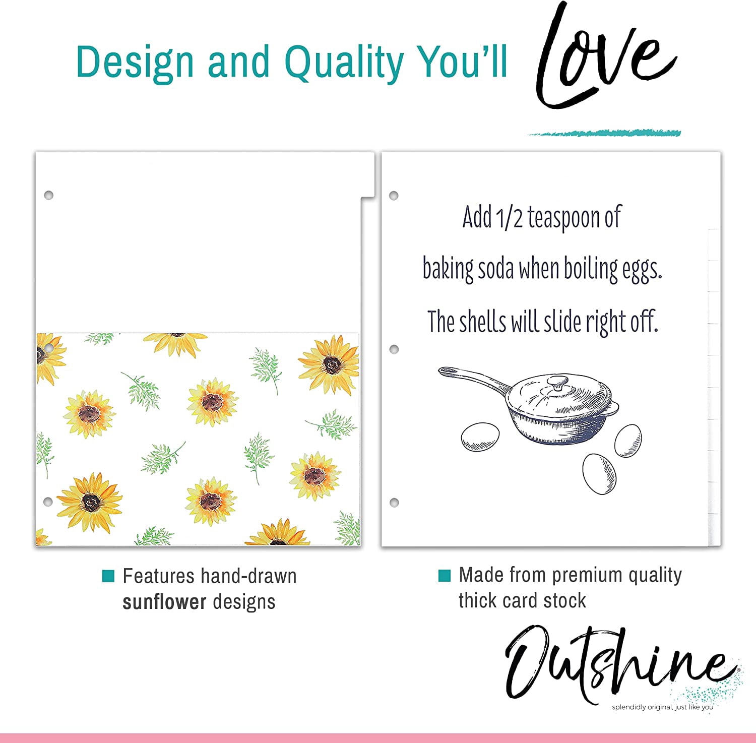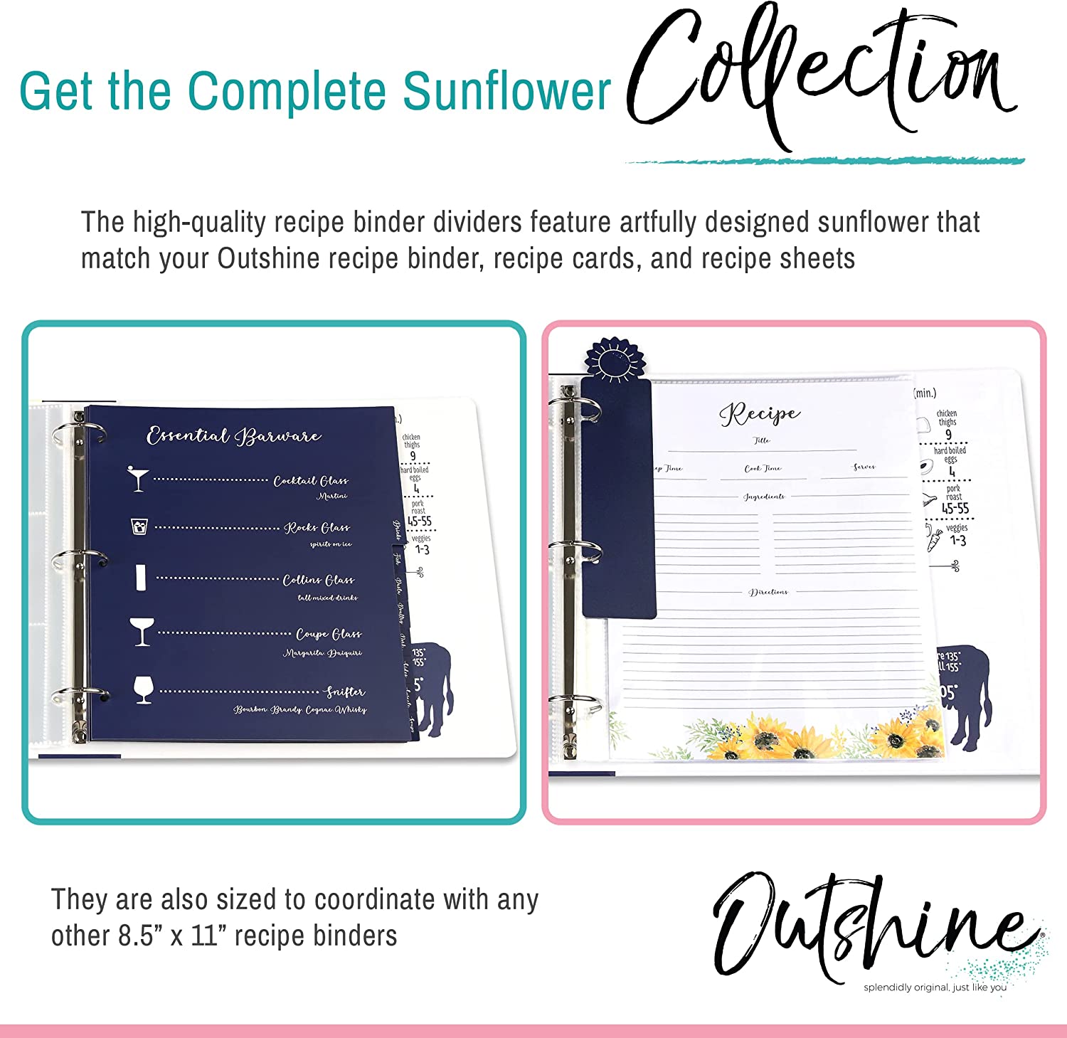 - GREAT GIFT & PERSONALIZED KEEPSAKE: This 12-pack recipe binder dividers set features a sunflower design that matches the Outshine sunflower recipe binder, but is also a great basic to fit any other 8.x5" x11" binder. Together they would make a wonderful bridal shower, wedding, anniversary, birthday, or Mother’s Day gift. Write recipes on the cards and gift your family or friends one of these cards to write their favorite recipe on and give back to create an amazing personalized collection.