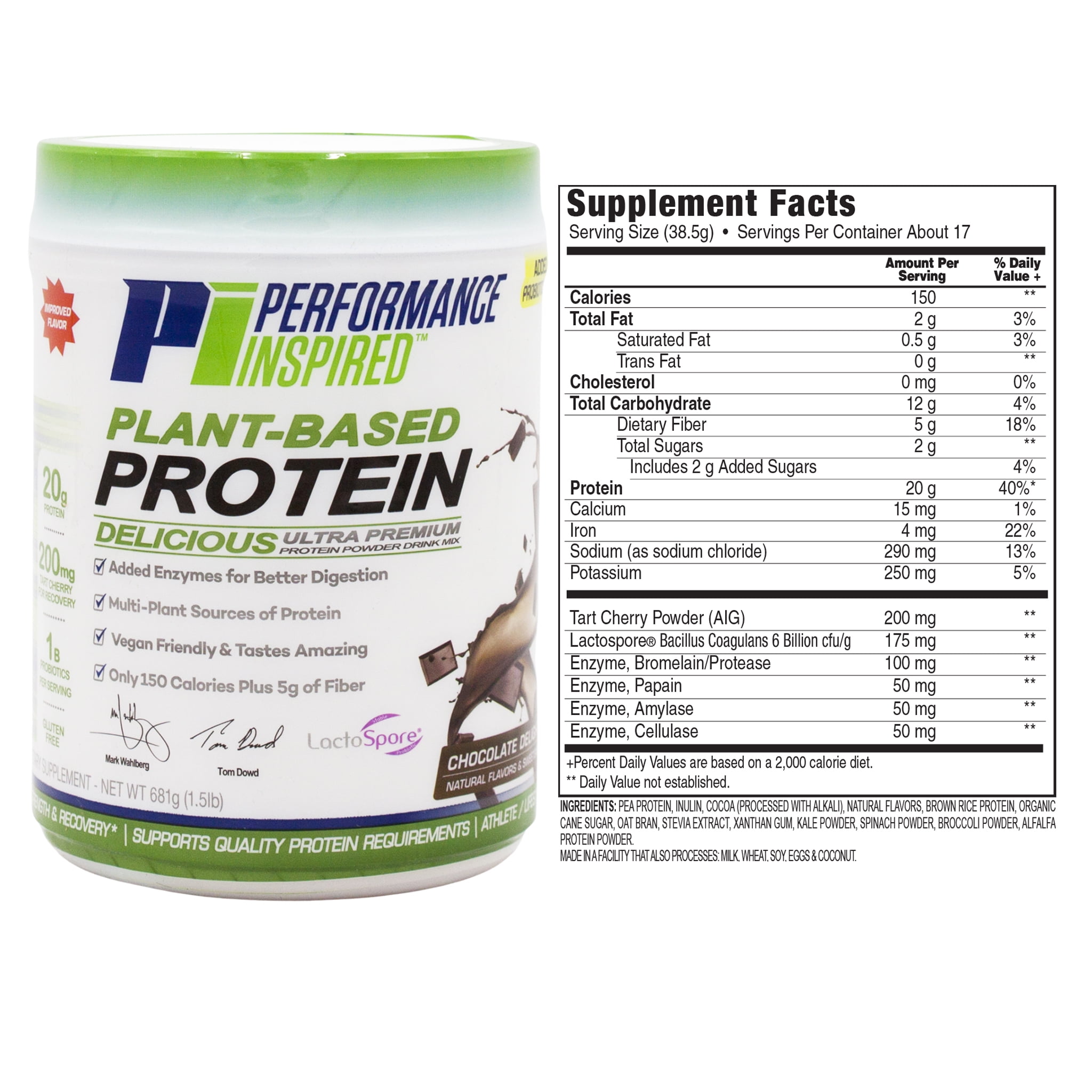 Our super clean, high-quality gluten-free Plant-Based Protein is loaded with a BIG 1 Billion of healthy probiotics to help with your digestive health, 200mg of tart cherry, and a full 20g of multi-plant source protein. PLUS, we added 5g of filling fiber along with powerful digestive enzymes to help stop bloating! High value all in one amazing formula you will love! Compare and you will upgrade to Performance Inspired! Our plant protein contains only natural ingredients and has zero sugar alcohols and zero soy. This low-sugar/calorie protein is also lactose and gluten free—a value-packed formula without any artificial sweeteners, flavors, or colors! Compare and you will upgrade to this complete natural protein containing the best ingredients, including probiotics, tart cherry, and our powerful enzyme and fiber formula. Our high-value product with only natural plant ingredients will help you exceed your protein and health goals each day! Fuel your life with nutrition you can trust. We put our names on the front because we are proud and stand behind our products! Honest in our marketing and our formulas! Co-founder by fitness fanatic, actor, and businessman Mark Wahlberg and former GNC executives to create a line of quality, high value, all-natural products people can trust. Formulated for the everyday athlete and professionals like co-owners WME/IMG, Bryson DeChambeau or Draymond Green that rely and trust our clean, robust formulas. Mixes easily and perfect for any diet, fitness and wellness needs. Not just for vegans, but for anyone looking for a high quality and delicious protein source! When you compare this formula you will upgrade Checkout all of our 35 plus family of amazing value-packed products and upgrade your supplements and nutrition! Trade up to our quality protein bars, creatine, energy water, protein cookies/chips, pre-works, BCAA, gainer, vegan protein, supplements, and our clean protein powders! Active lifestyle products you can trust will always be amazing! Compare and you will upgrade! Natural is Better – Be Better!