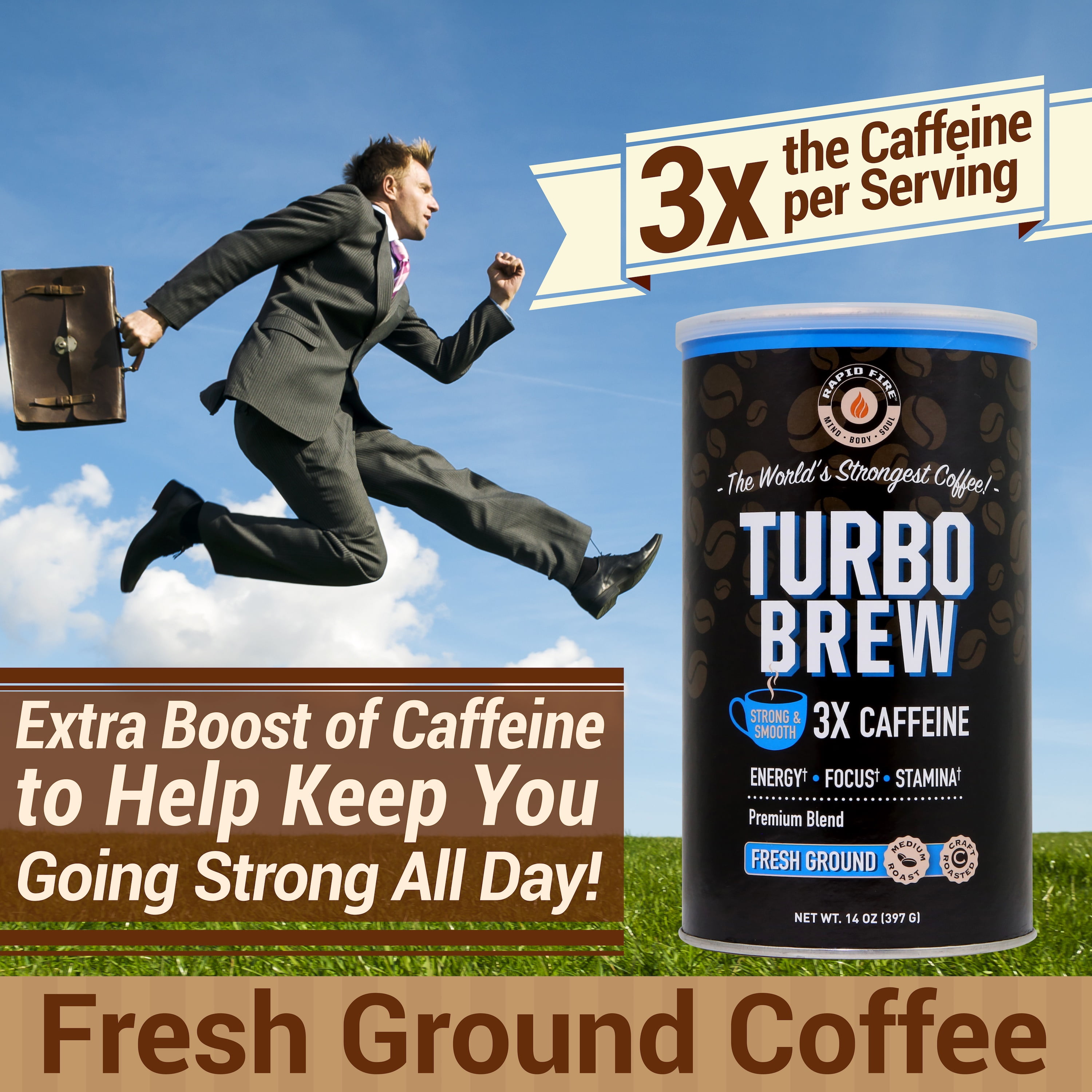 - TURBO BREW WITH 3X CAFFEINE. Three tablespoons of these potent ground coffee beans brewed with hot water provides 3 times the caffeine to help provide energy, focus and stamina.