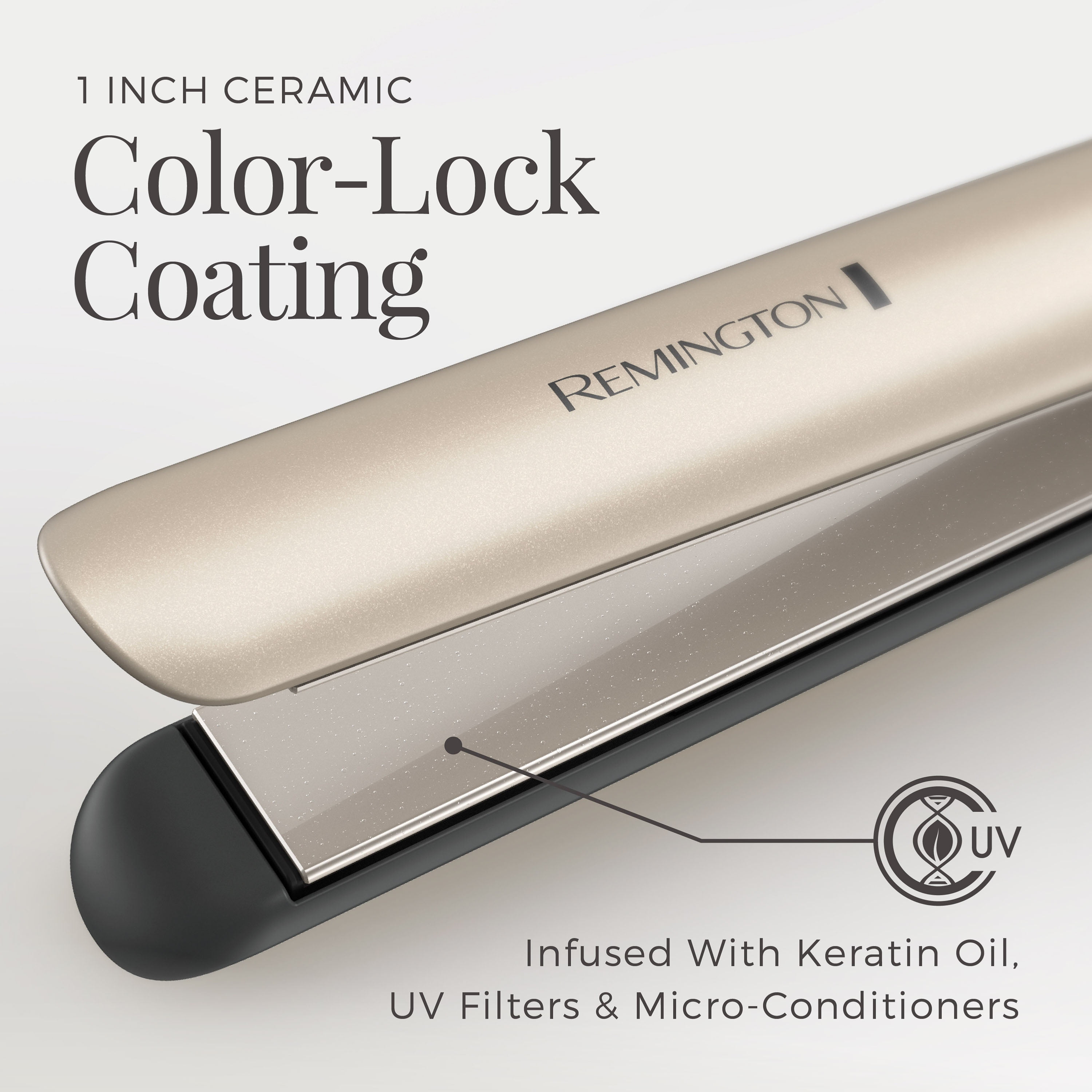 Get more from your color treatment with the Remington Pro 1" Flat Iron with Color Care Technology. It features a Heat Control Sensor that, when activated, detects when the flat iron plates are in contact with your hair, and then automatically adjusts the temperature to prevent overheating for 2X less damage and 5X longer-lasting color. (This feature can be turned on and off.) The 1 floating ceramic plates deliver a smooth glide, with a Ceramic Color-Lock Coating that’s infused with keratin oil, UV filters, and micro-conditioners that lock in a vibrant shine to your styles. Plus, this flat iron includes five digital heat settings and heats up in just 30 seconds so you can quickly create your salon-quality finish.